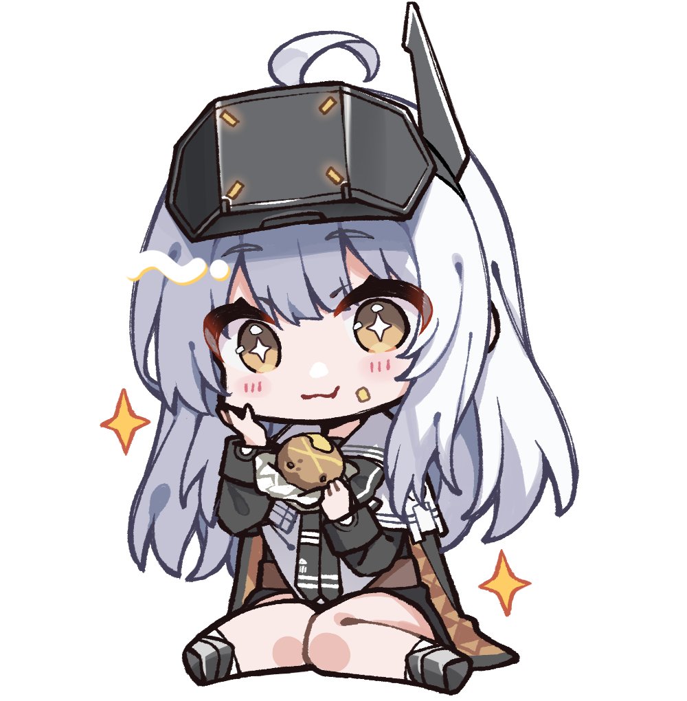 1girl ahoge black_bow black_bowtie black_shirt blush bowtie chibi cloak eating goddess_of_victory:_nikke kyouhanechaou long_hair shirt simple_background sitting snow_white_(innocent_days)_(nikke) snow_white_(nikke) solo visor_(armor) white_cloak white_hair yatanukikey yellow_eyes