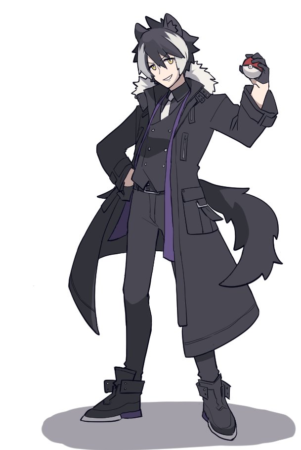 1boy animal_ears ankle_boots belt belt_buckle black_belt black_boots black_coat black_gloves black_hair black_pants black_shirt black_vest boots buckle buttons coat collared_shirt double-breasted full_body fur-trimmed_coat fur_trim gloves hair_between_eyes half_gloves hand_on_own_hip hand_up holding holding_poke_ball holostars jackal_boy jackal_ears jackal_tail kageyama_shien looking_at_viewer male_focus multicolored_hair necktie nintendo open_clothes open_coat pants parody parted_lips poke_ball pokemon seri-seri shirt short_hair simple_background smile solo standing stole style_parody tail two-tone_hair v-shaped_eyebrows vest virtual_youtuber white_background white_hair white_necktie yellow_eyes