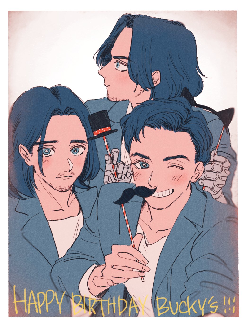 3boys animal_ears animification black_hair black_headwear blue_eyes blue_jacket blush border captain_america:_civil_war captain_america:_the_first_avenger captain_america:_the_winter_soldier captain_america_(series) cat_ears closed_mouth collarbone collared_jacket commentary_request facial_hair fake_animal_ears fingernails grey_background hand_up happy_birthday hat highres holding jacket bucky_barnes long_sleeves looking_at_viewer looking_to_the_side male_focus marvel marvel mini_hat multiple_boys multiple_persona one_eye_closed open_clothes open_jacket prosthesis prosthetic_arm shirt short_hair simple_background smile standing t-shirt teeth tkrckr v-shaped_eyebrows white_border white_shirt