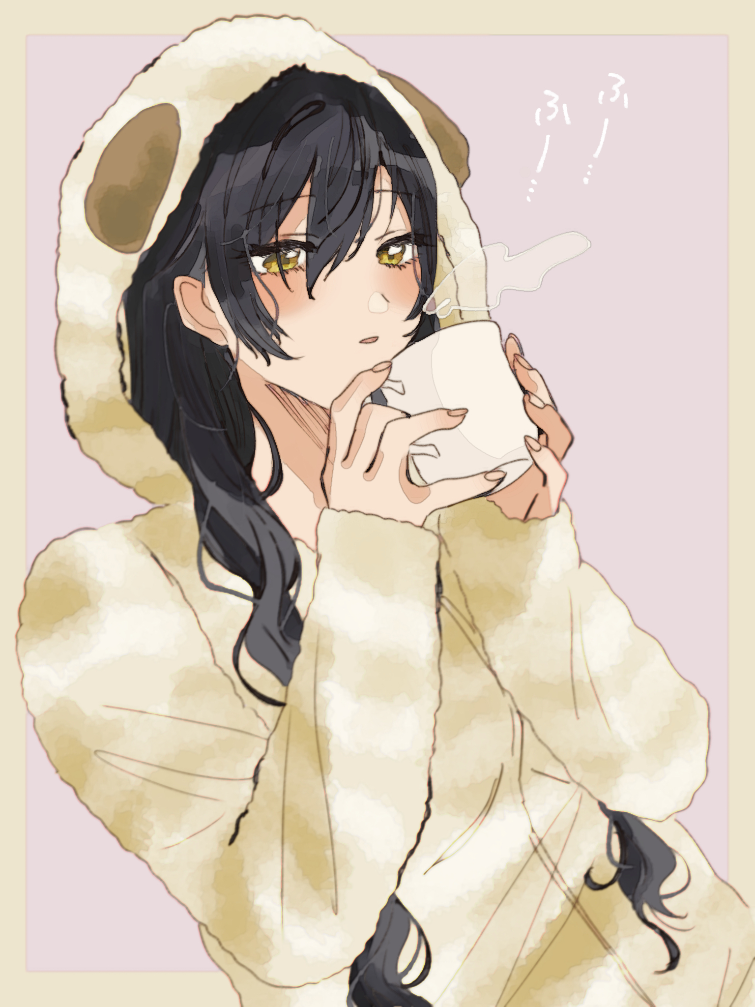 1girl black_hair blowing blush cup fur_jacket hair_between_eyes highres holding holding_cup hood hood_up hooded_jacket idolmaster idolmaster_shiny_colors jacket long_hair mug paddy_field shirase_sakuya simple_background solo steam two-tone_background upper_body very_long_hair yellow_eyes