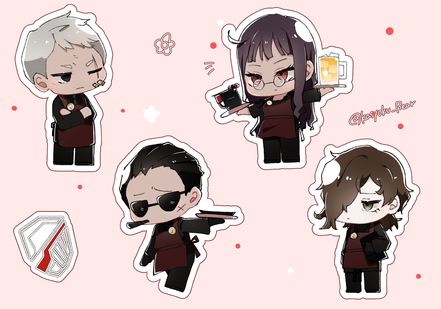 3boys apron black_hair black_shirt boris_(project_moon) brown_hair chibi denis_(project_moon) full_body glasses green_eyes hair_over_one_eye highres holding holding_menu holding_tray kalo_(project_moon) kasyoku_bear katriel_(project_moon) library_of_ruina long_hair menu multiple_boys one_eye_closed project_moon purple_hair red_apron red_eyes shirt sunglasses the_thumb_(project_moon) tray