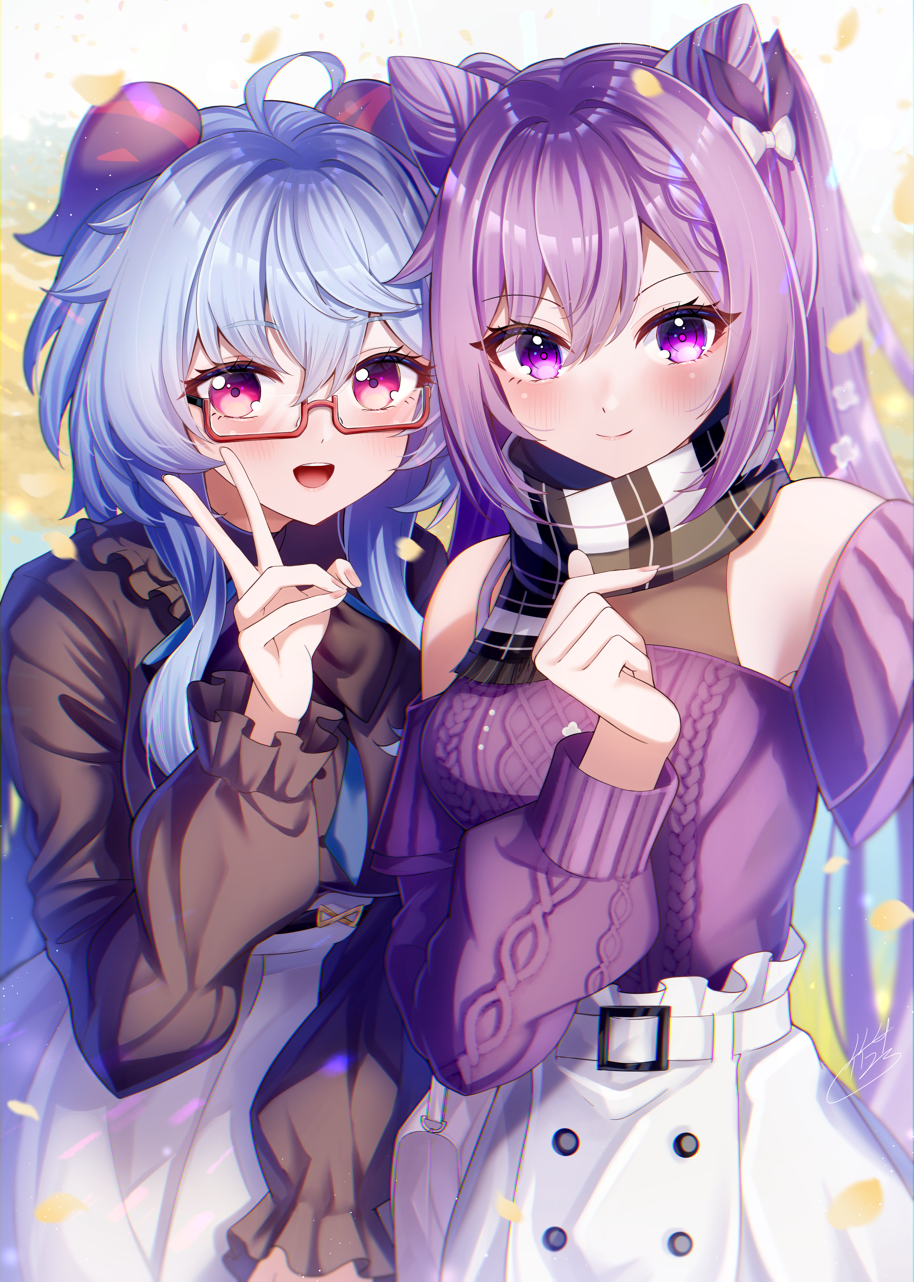 2girls absurdres ahoge blue_hair bow braid closed_mouth cone_hair_bun double_bun finger_heart ganyu_(china_merchants_bank)_(genshin_impact) ganyu_(genshin_impact) genshin_impact glasses goat_horns hair_between_eyes hair_bow hair_bun highres horns keqing_(genshin_impact) keqing_(lantern_rite)_(genshin_impact) long_sleeves looking_at_viewer multiple_girls official_alternate_costume open_mouth outdoors pink_eyes red-framed_eyewear scarf sidelocks skirt smile sweater takemura_kou teeth twintails upper_teeth_only v white_bow white_skirt yuri