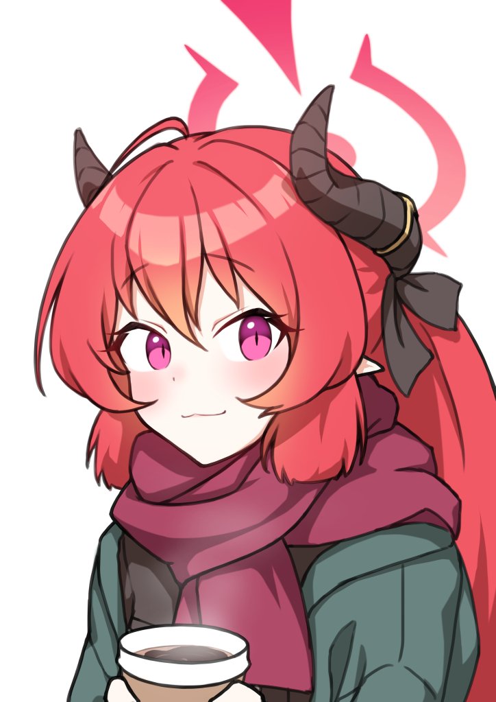 1girl ahoge blue_archive blunt_tresses closed_mouth coat coffee cup green_coat halo holding holding_cup horns hr.r junko_(blue_archive) long_hair long_sleeves looking_at_viewer pink_eyes pointy_ears red_hair scarf sidelocks simple_background slit_pupils smile solo steam upper_body white_background