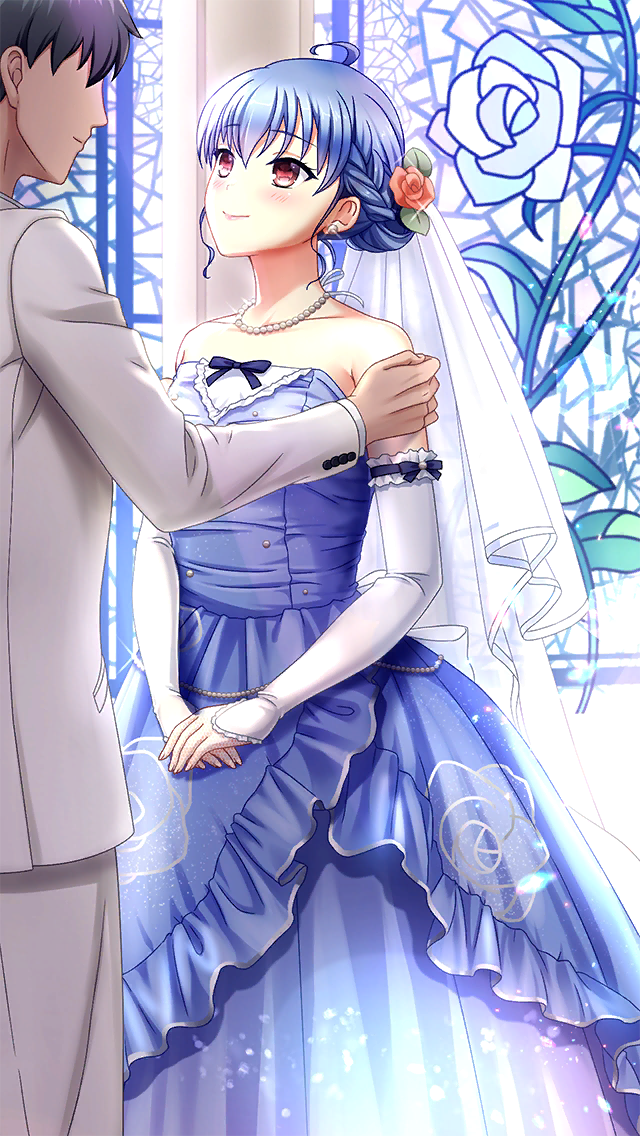 1boy 1girl anklet black_hair blue_dress blue_hair blush braid bridal_veil closed_mouth collarbone couple doukyuusei_(series) doukyuusei_another_world dress elbow_gloves faceless faceless_male flower game_cg gloves hair_between_eyes hair_flower hair_ornament hetero indoors jewelry kakyuusei_(series) kakyuusei_2 layered_dress long_dress looking_at_another looking_up official_art red_eyes red_flower short_hair smile solo_focus stained_glass standing strapless strapless_dress takatoo_nanase veil wedding wedding_dress white_gloves
