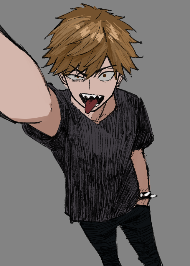 1boy black_pants brown_eyes brown_hair chainsaw_man collar denji_(chainsaw_man) grey_background grey_shirt looking_at_viewer pants selfie sharp_teeth shirt short_hair spiked_collar spikes teeth tongue tongue_out zeon_(zzeeonn)