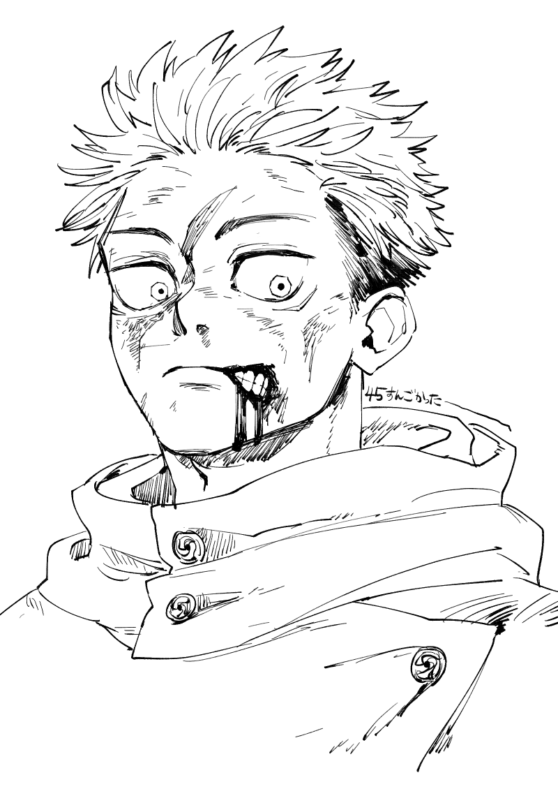 1boy blood blood_on_face closed_mouth greyscale hood hood_down hoodie ism_ppp itadori_yuji jujutsu_kaisen male_focus monochrome scar scar_on_face short_hair simple_background solo teeth upper_body