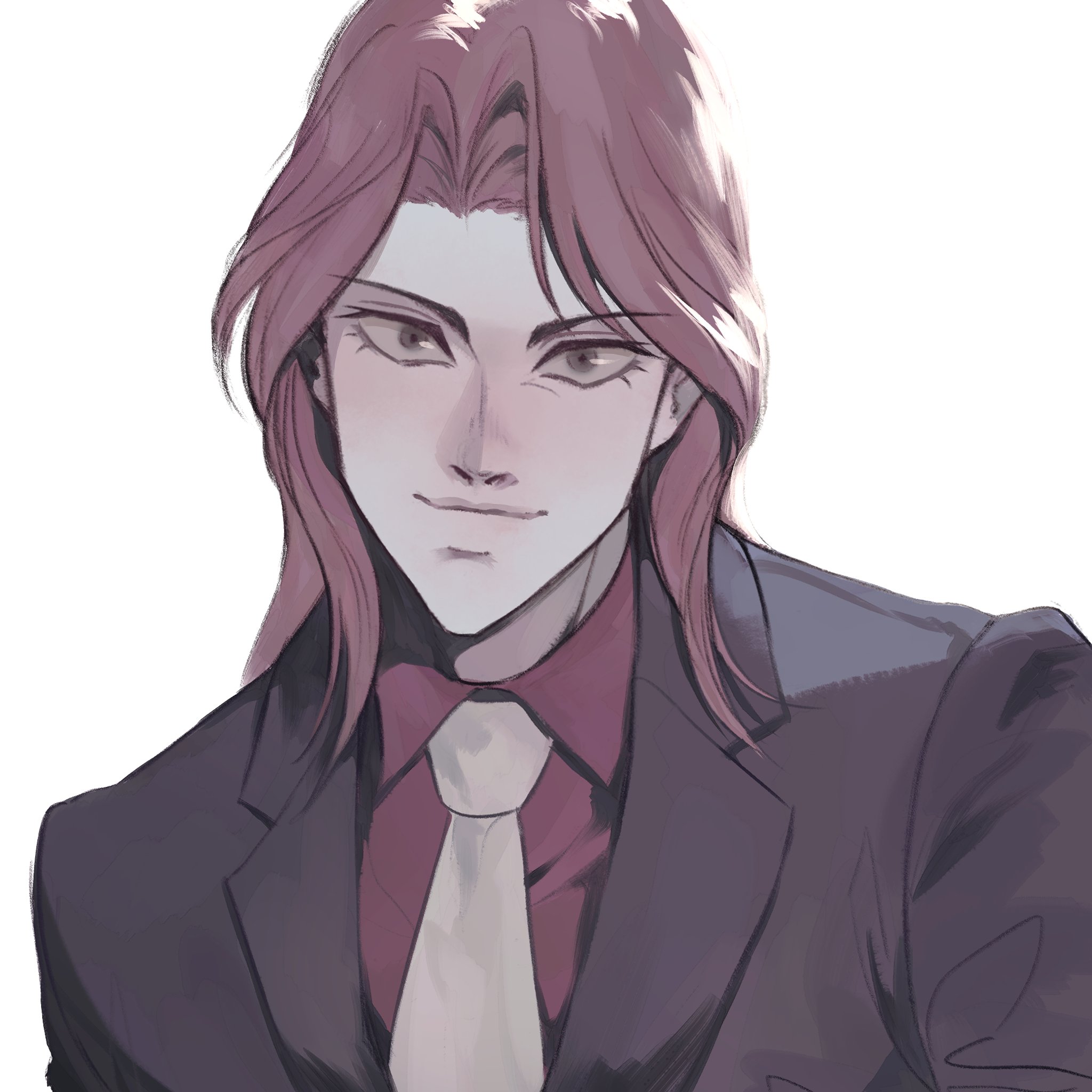 1boy black_jacket blazer brown_hair closed_mouth collared_shirt commentary_request eyelashes formal_clothes grey_eyes highres ichijou_seiya jacket tobaku_mokushiroku_kaiji korean_commentary long_hair looking_at_viewer male_focus necktie panespaghetti parted_bangs red_shirt shirt simple_background smile solo suit upper_body white_background white_necktie