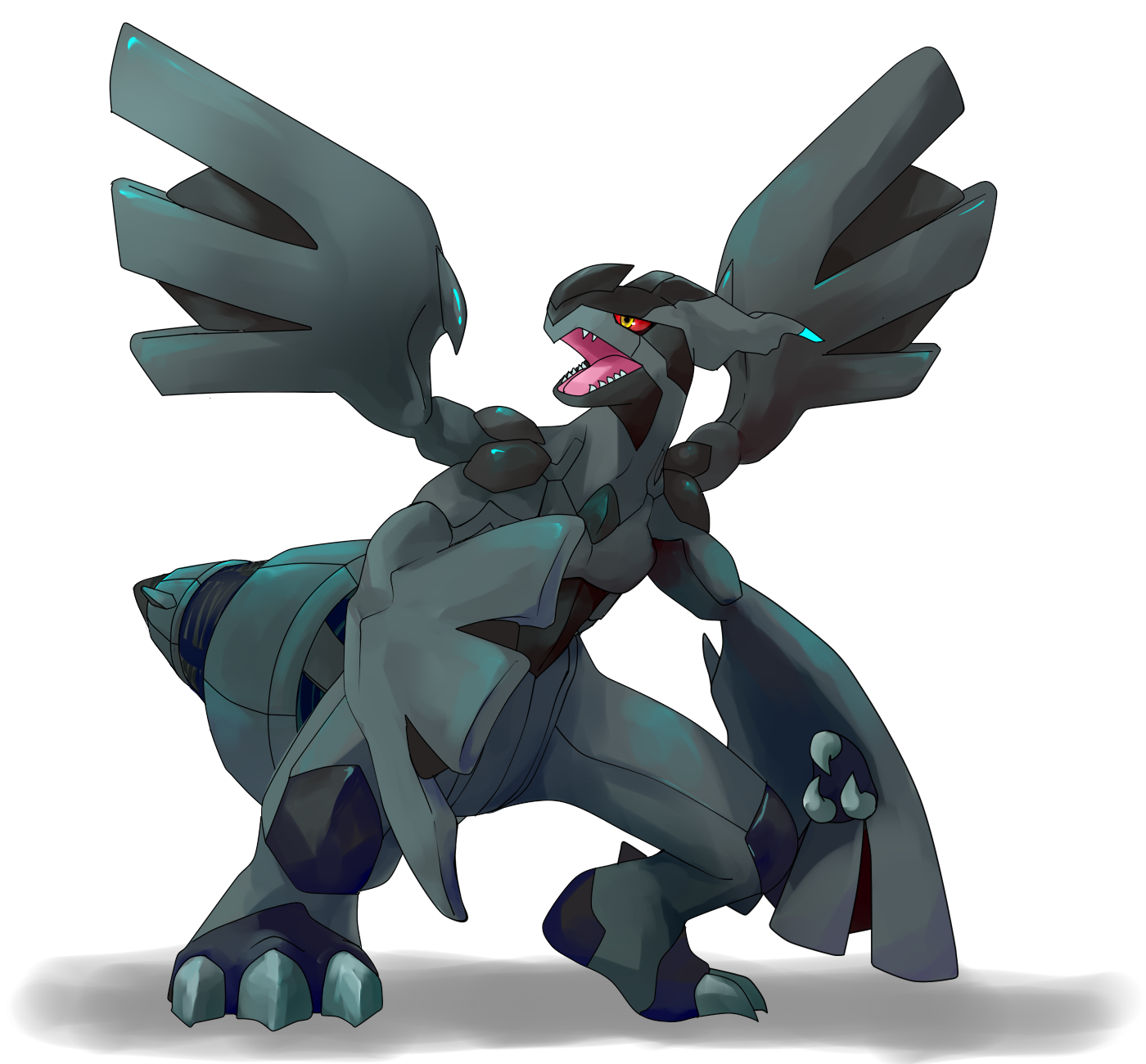 animal_focus claws colored_sclera commentary dragon gen_5_pokemon highres legendary_pokemon looking_up nintendo no_humans open_mouth pokemon pokemon_(creature) red_sclera sharp_teeth simple_background solo standing teeth yellow_eyes zekrom zuu_(turedure)
