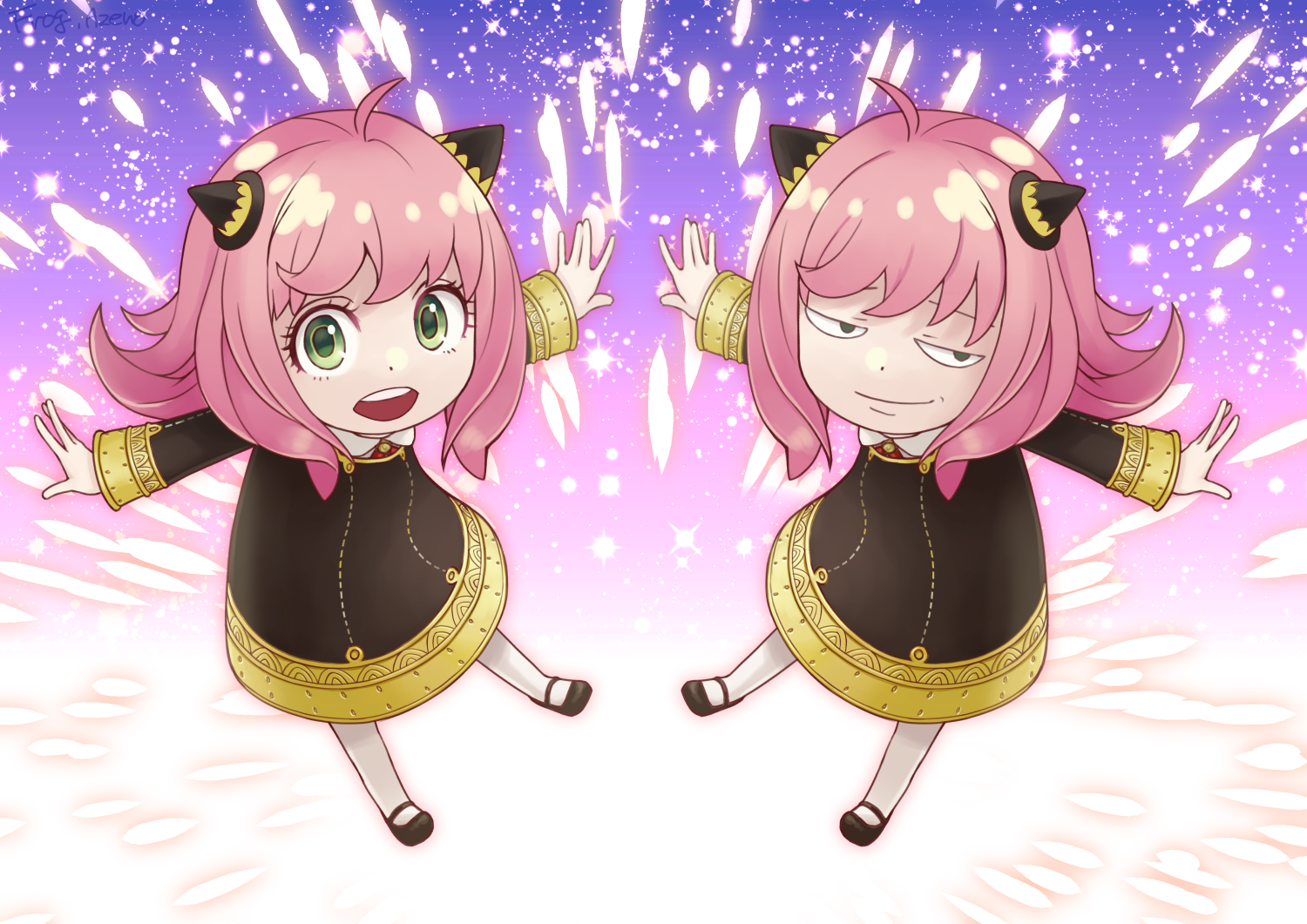 2girls anya's_heh_face_(meme) anya_(spy_x_family) black_dress black_footwear child clone collared_shirt dress eden_academy_school_uniform eyelashes hairpods kaeru_(csit24) meme multiple_girls open_mouth outstretched_arms pantyhose pink_hair red_ribbon ribbon school_uniform shirt smug spread_arms spy_x_family teeth upper_teeth_only white_pantyhose white_shirt