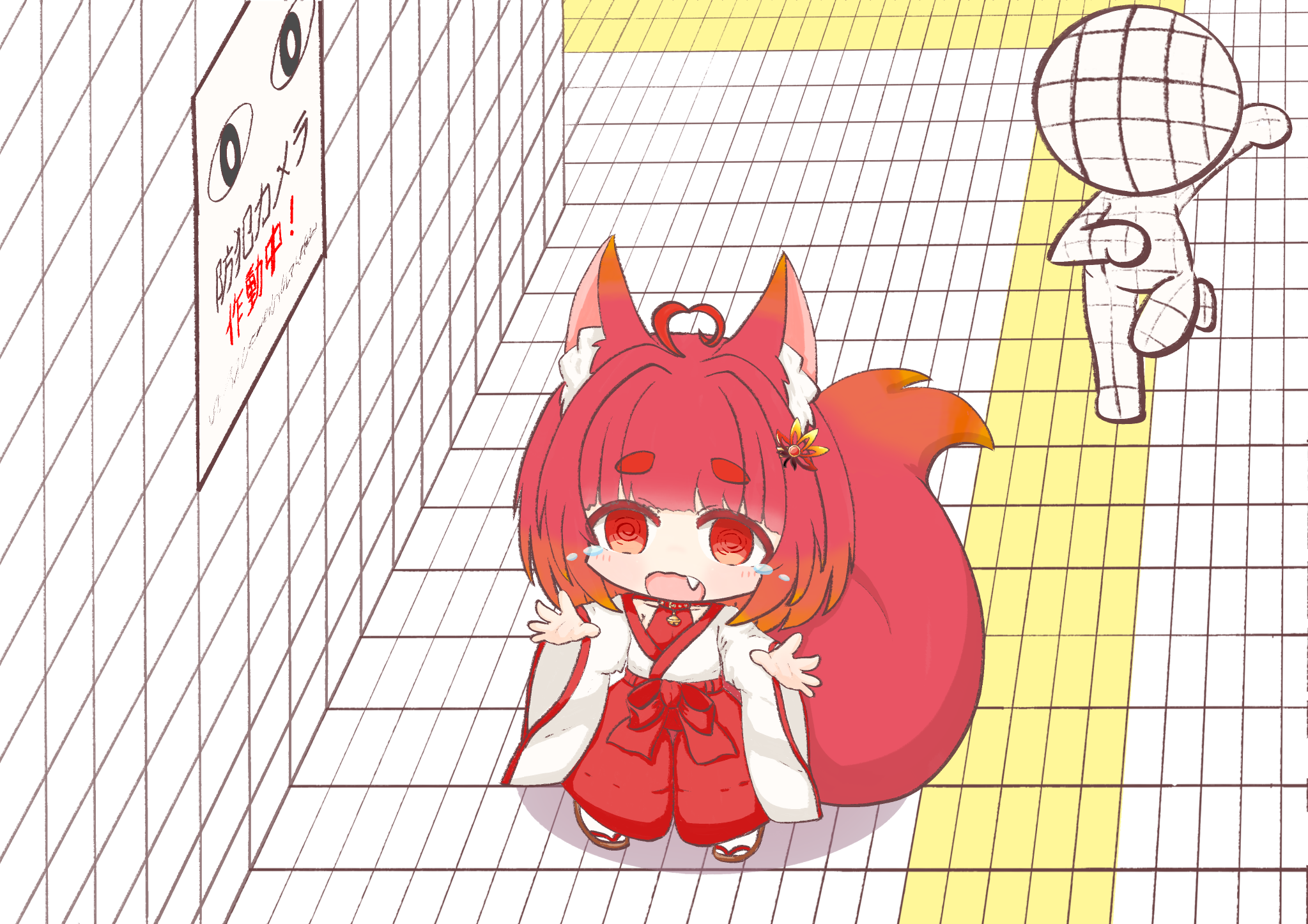 1girl 1other @_@ ad ahoge animal_ear_fluff animal_ears blunt_bangs crying crying_with_eyes_open fang fox_ears fox_girl fox_tail full_body gradient_hair hair_ornament hakama hakama_pants hallway highres japanese_clothes kimono mokezi multicolored_hair open_mouth original pants poster_(object) red_eyes red_hair red_hakama sandals shadow short_hair sidelocks sign standing tactile_paving tail tears the_exit_8 thick_eyebrows tile_floor tile_wall tiles translation_request white_kimono wide_sleeves zouri