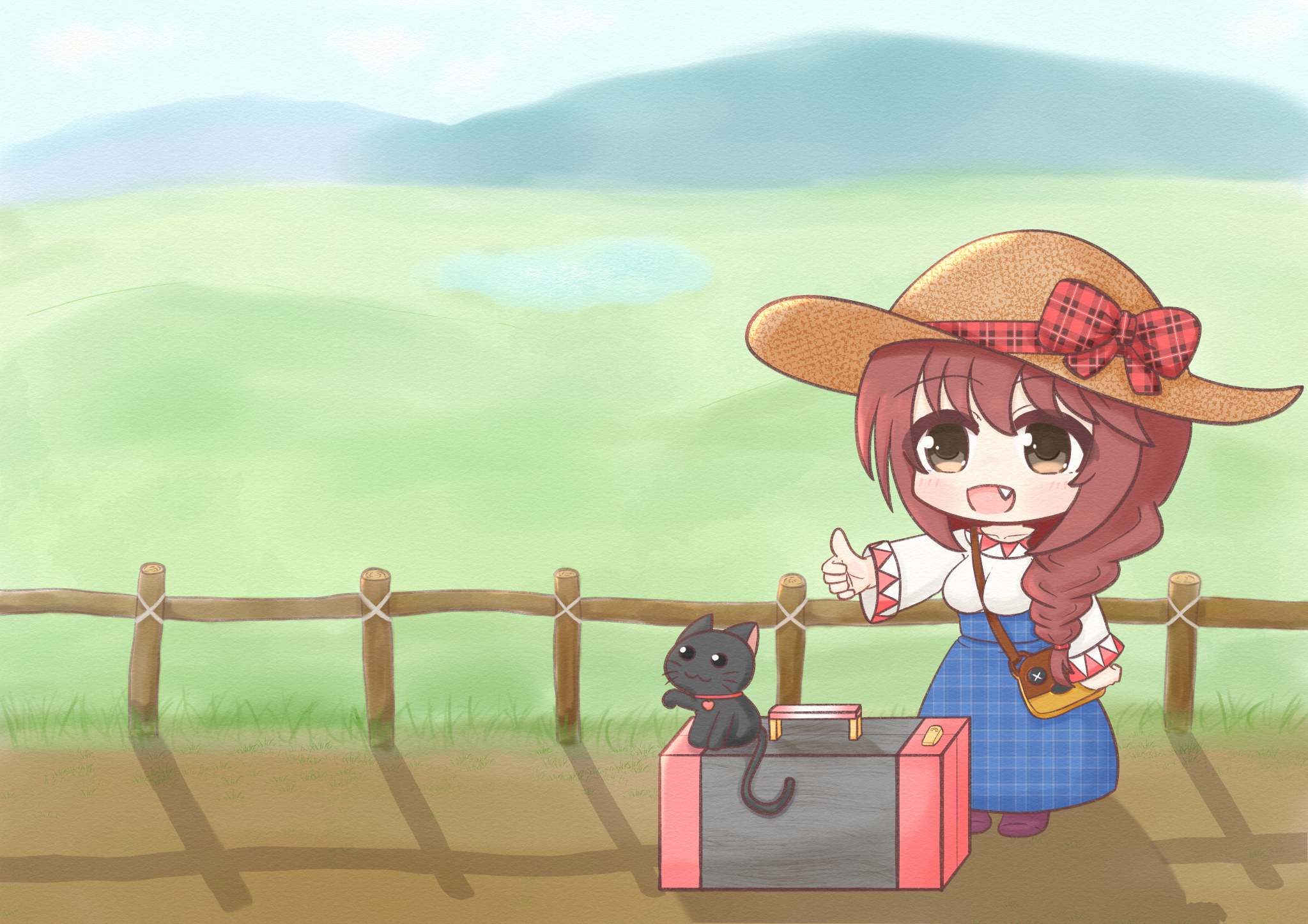 1girl :d bag between_breasts black_cat blue_skirt bow braid breasts brown_eyes brown_hair brown_headwear cat chibi collarbone commentary_request day fang fence full_body hair_over_shoulder hat hat_bow hat_ribbon highres hitchhiking long_skirt long_sleeves medium_breasts mokezi mountainous_horizon open_mouth original outdoors plaid_bow plaid_clothes plaid_skirt ribbon road shadow shirt shoulder_bag sidelocks single_braid skirt smile standing strap_between_breasts suitcase thumbs_up white_shirt wooden_fence