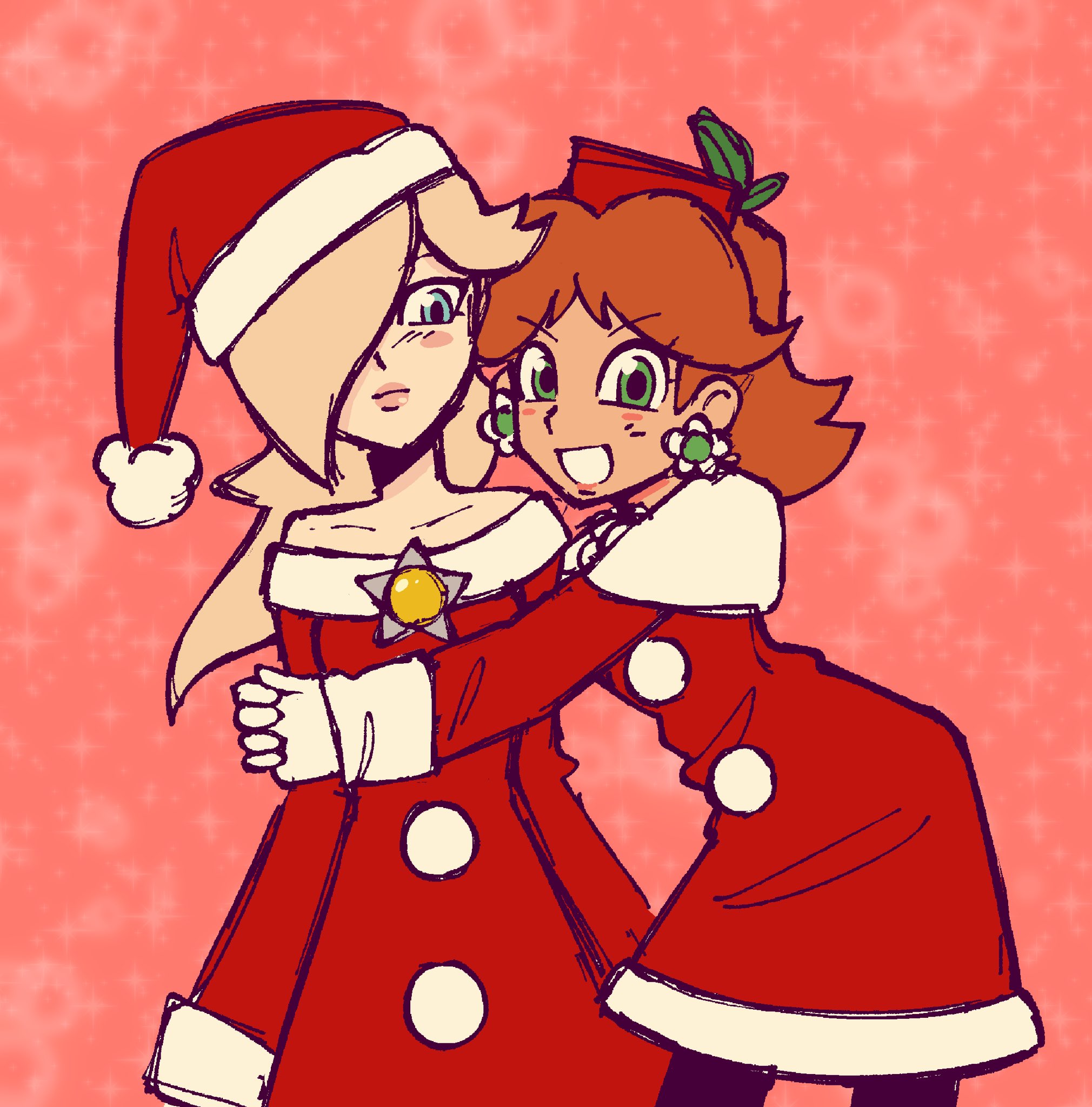 2girls alternate_costume blue_eyes blue_hair blush breasts brown_hair christmas earrings expressionless flower_earrings gloves grin hair_over_one_eye hat highres hug jewelry looking_at_another mario_(series) mario_kart mario_kart_tour multiple_girls nintendo princess_daisy princess_daisy_(holiday_cheer) rosalina santa_costume santa_hat small_breasts smile standing