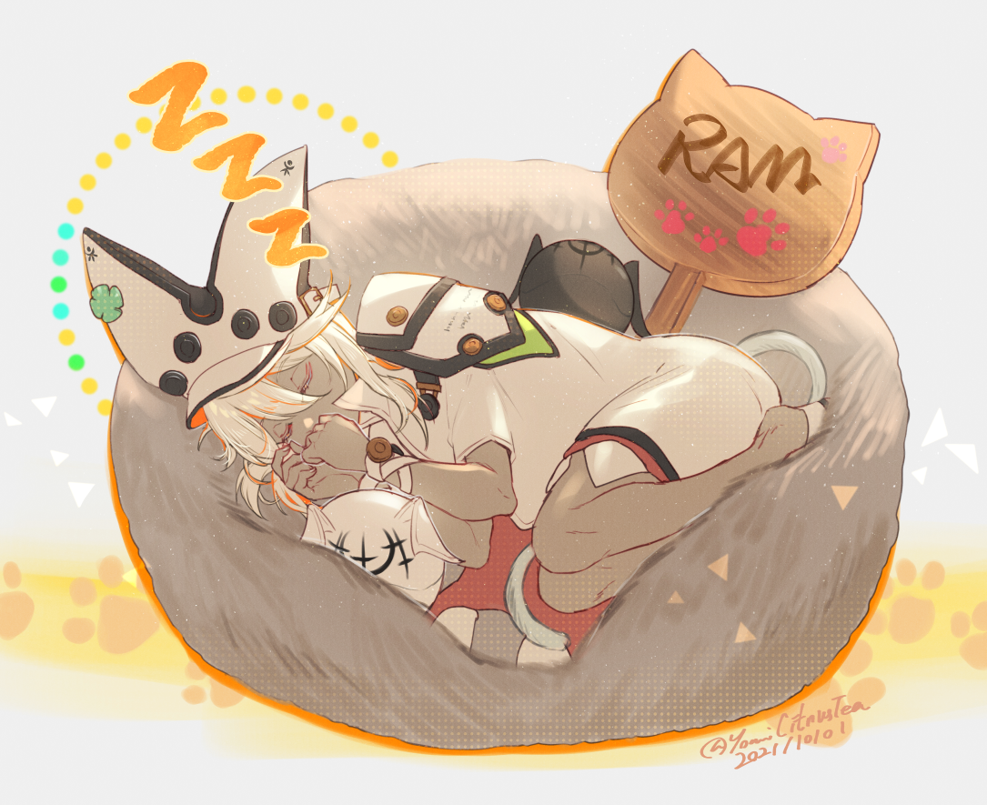 1girl cat_tail closed_eyes curled_up dark-skinned_female dark_skin guilty_gear lucifero_(guilty_gear) paw_print sleeping tail white_hair youmicitrustea zzz