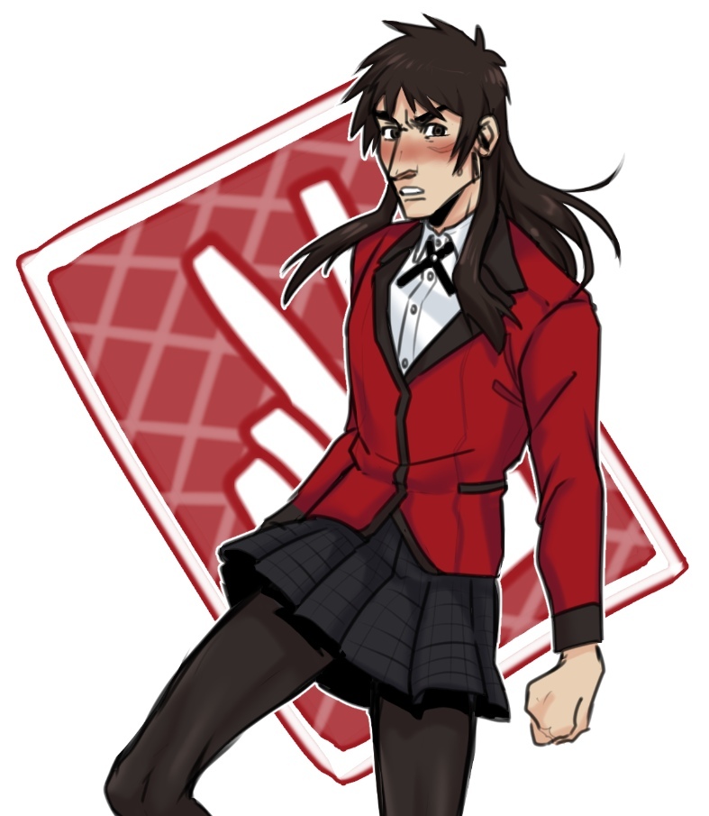 1boy black_hair black_pantyhose black_ribbon black_skirt blazer blush buttons card clenched_hand collared_shirt commentary cross_tie crossdressing crossdressing_(mtf) english_commentary facial_scar feet_out_of_frame hyakkaou_academy_school_uniform itou_kaiji jacket tobaku_mokushiroku_kaiji kakegurui lollydoom long_hair long_sleeves looking_at_viewer male_focus neck_ribbon nose_blush pantyhose parted_lips playing_card pleated_skirt pointy_nose red_jacket ribbon scar scar_on_cheek scar_on_face school_uniform shirt short_bangs skirt solo standing white_background white_shirt