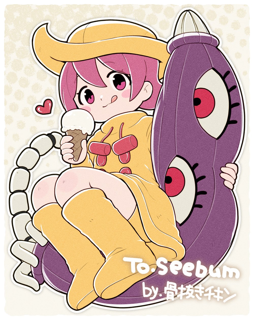 1girl blush_stickers boots chibi commission food hat heart highres hnnkckn hungern_(skullgirls) ice_cream ice_cream_cone licking_lips looking_at_viewer pink_eyes pink_hair raincoat short_hair shorts skullgirls solo tongue tongue_out umbrella umbrella_(skullgirls) yellow_background
