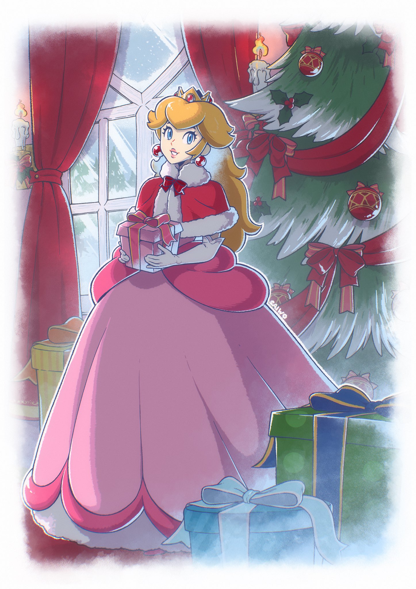 1girl blonde_hair blue_eyes box candle christmas christmas_tree crown dress earrings elbow_gloves fire full_body fur-trimmed_poncho gift gift_box gloves highres holding holding_gift indoors jewelry long_hair looking_at_viewer mario_(series) nintendo pink_dress princess_peach curtains red_poncho saiwo_(saiwoproject) solo sphere_earrings white_gloves