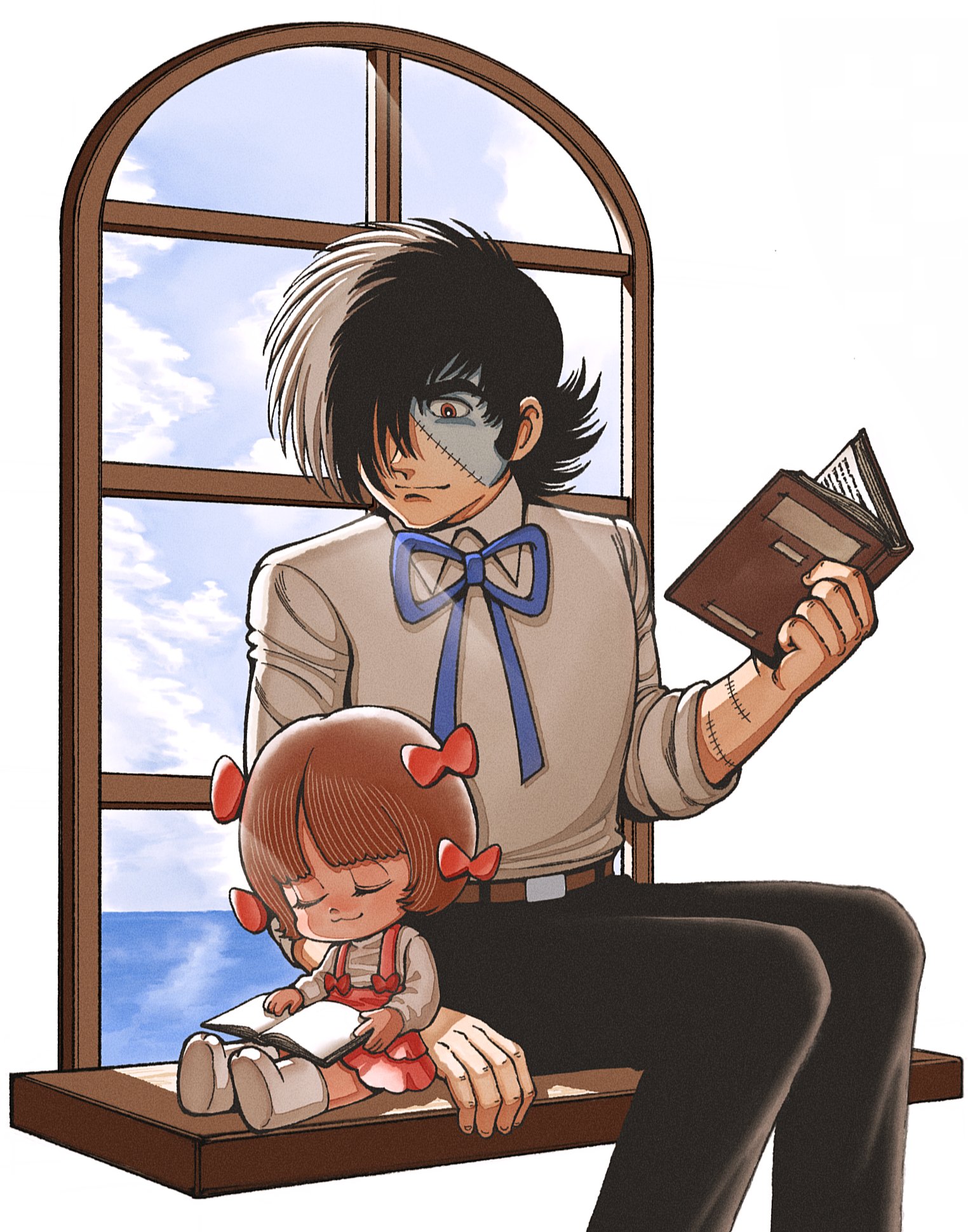1boy 1girl :3 belt black_hair black_jack_(character) black_jack_(series) black_pants blue_ribbon book bow brown_belt brown_eyes brown_hair child dress hair_bow hair_over_one_eye highres holding holding_book long_sleeves looking_at_another looking_at_viewer multicolored_hair multiple_hair_bows oldkin pants pink_dress pinoko ribbon shirt short_hair sitting sleeping sleeping_upright split-color_hair stitched_arm stitched_face stitches white_footwear white_hair white_shirt window windowsill