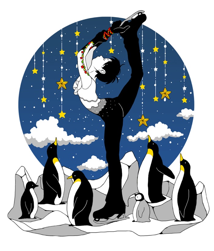 1boy animal arms_up ayuyu_(baby) baby_animal bird black_hair black_pants closed_eyes cloud colored_skin figure_skating from_side hanyuu_yuzuru ice_skates leg_up male_focus pants penguin penguin_chick real_life shirt short_hair skates standing standing_on_one_leg star_(symbol) white_background white_shirt white_skin