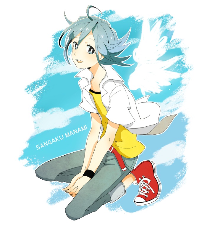 1boy ahoge ayuyu_(baby) belt bright_pupils character_name drawn_wings grey_eyes grey_hair grey_pants jacket looking_at_viewer male_focus manami_sangaku open_clothes open_jacket open_mouth pants red_belt red_shoes shirt shoes short_hair sneakers solo squatting teeth upper_teeth_only white_jacket white_pupils white_wings wings yellow_shirt yowamushi_pedal