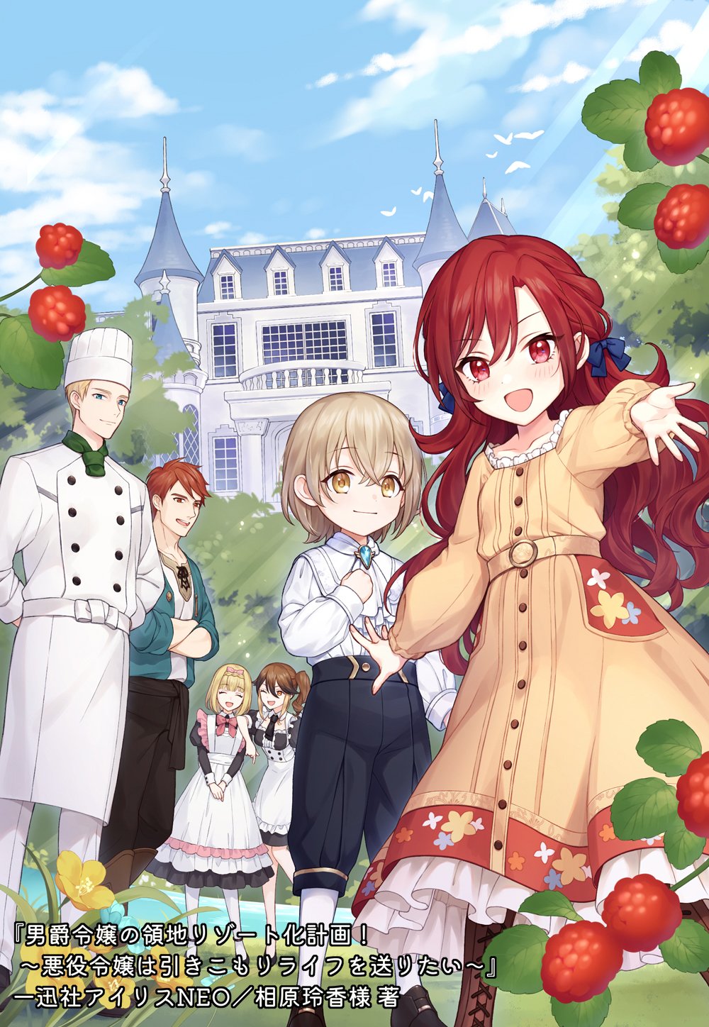 3boys 3girls :d ;d ^_^ apron aqua_shirt arm_on_another's_shoulder arms_behind_back ascot beckoning bird black_dress black_footwear black_necktie black_pants black_sash blonde_hair blue_bow blue_eyes bob_cut boots bow bow_hairband bowtie brooch brown_footwear brown_hair building buttons capri_pants chef chef_hat child clenched_hand closed_eyes closed_mouth cloud cover cover_page crossed_arms danshaku_reijou_no_ryouchi_resort_ka_keikaku! day detached_collar double-breasted dress feet_out_of_frame floral_print flower food frilled_apron frills fruit grass hair_between_eyes hair_bow hairband hand_on_own_chest hat highres jacket jewelry juliet_sleeves lace-up_boots loafers long_dress long_hair long_sleeves looking_at_viewer maid maid_apron mansion masami_(souzou_jinsei_sanka) multicolored_hair multiple_boys multiple_girls necktie novel_cover official_art one_eye_closed open_mouth orange_eyes outdoors pants pantyhose pink_bow pink_bowtie plant pond puffy_long_sleeves puffy_short_sleeves puffy_sleeves raspberry red_eyes red_hair sash shirt shirt_tucked_in shoes short_hair short_sleeves side_ponytail sidelocks sleeves_rolled_up smile socks standing swept_bangs toque_blanche tree two-tone_hair waist_apron water white_apron white_ascot white_jacket white_pants white_pantyhose white_shirt white_socks yellow_dress yellow_eyes yellow_flower