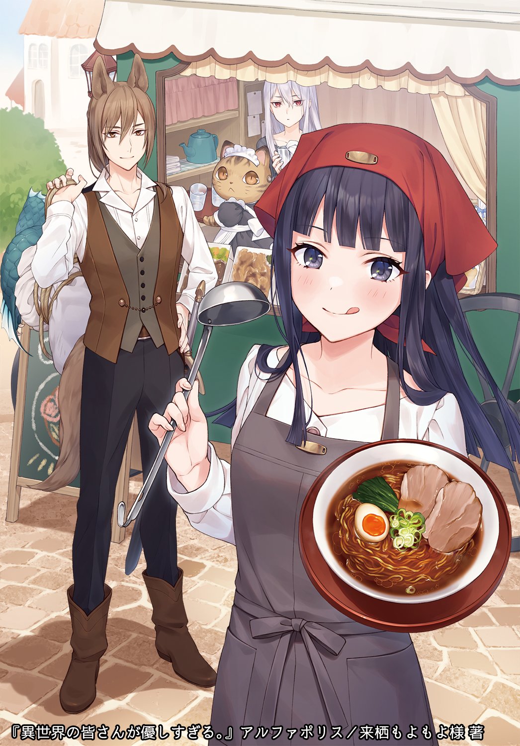 1boy 2girls :q animal animal_ears apron black_hair black_pants blunt_bangs blunt_ends boots bowl box brown_apron brown_eyes brown_footwear brown_hair brown_vest building cat cleaning closed_mouth clothed_animal cover cover_page cup drinking_glass expressionless fantasy food food_stand hair_between_eyes hand_on_own_hip headscarf highres holding holding_cloth holding_ladle holding_plate holding_sack holding_tray horse_boy horse_ears horse_tail isekai_no_minasan_ga_yasashi_sugiru kettle ladle long_hair long_sleeves maid masami_(souzou_jinsei_sanka) meat menu_board monster multiple_girls non-humanoid_robot noodles novel_cover official_art outdoors pants pavement plate ponytail ramen red_eyes red_headscarf robot robot_animal sack sheath sheathed shirt sidelocks softboiled_egg standing sword tail tongue tongue_out tray tree vest weapon white_hair white_shirt wing_collar