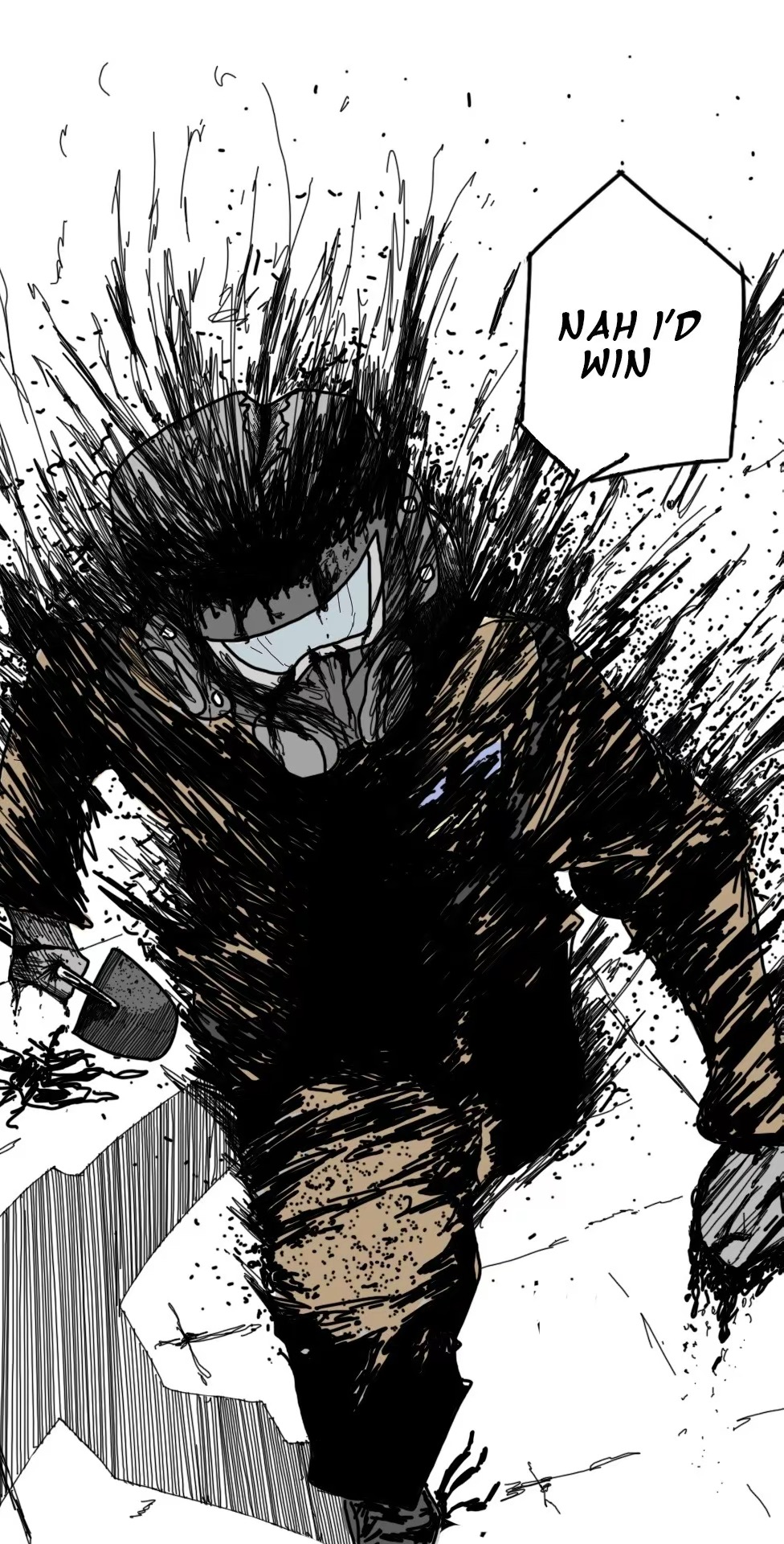 1other angry bodysuit gloves hazmat_suit highres holding holding_shovel improvised_weapon jujutsu_kaisen lethal_company long_sleeves mask meme menacing nah_i'd_win_(meme) oxygen_mask shovel solo walking worker_(lethal_company)