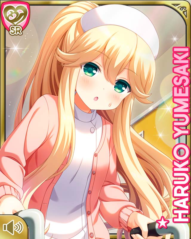 1girl :o alternate_hairstyle blonde_hair card_(medium) cardigan character_name day dress girlfriend_(kari) green_eyes hat indoors long_hair nurse nurse_cap official_art open_mouth pink_cardigan qp:flapper standing tagme white_dress white_headwear yumesaki_haruko