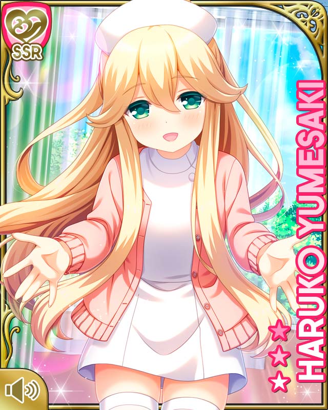 1girl :d alternate_hairstyle blonde_hair card_(medium) cardigan character_name day dress girlfriend_(kari) green_eyes hat indoors long_hair nurse nurse_cap official_art open_mouth pink_cardigan qp:flapper smile standing tagme white_dress white_headwear window yumesaki_haruko