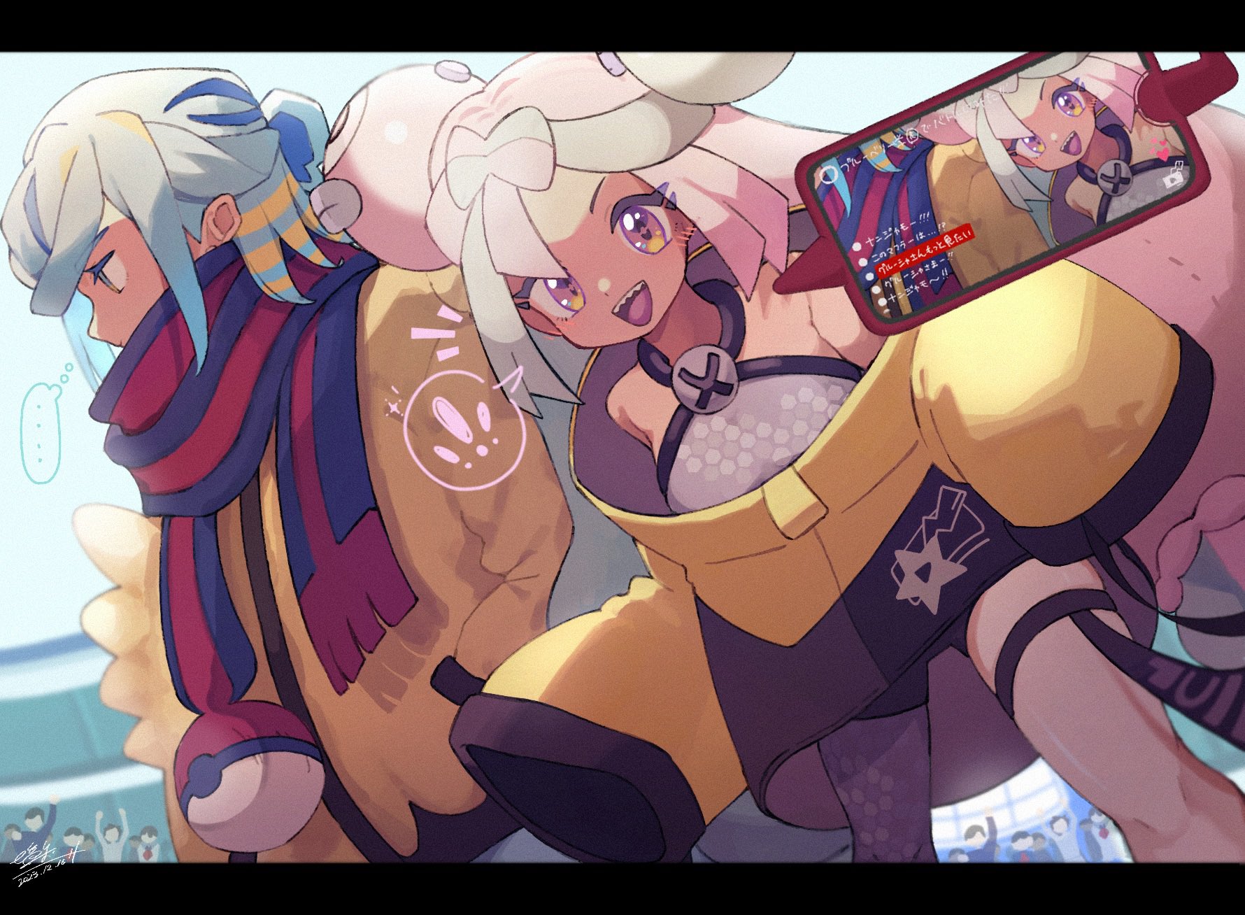 ! ... 1boy 1girl 217_shion_407 aqua_hair blonde_hair blue_hair bow-shaped_hair day gen_4_pokemon grey_pantyhose grusha_(pokemon) highres iono_(pokemon) jacket letterboxed livestream long_hair long_sleeves looking_at_viewer multicolored_hair nintendo open_mouth outdoors oversized_clothes pantyhose pink_eyes pink_hair pokemon pokemon_(creature) pokemon_scarlet_and_violet rotom rotom_phone scarf sharp_teeth single_leg_pantyhose sleeves_past_fingers sleeves_past_wrists sparkle spoken_exclamation_mark teeth two-tone_scarf very_long_hair yellow_jacket