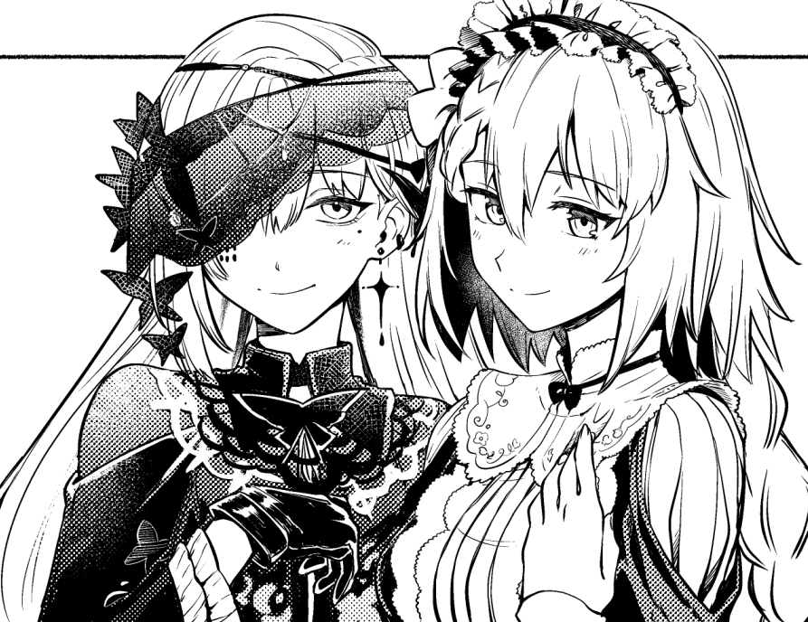 2girls black_dress black_veil centaureissi_(neural_cloud) closed_mouth clotho_(neural_cloud) commentary_request dress earrings frilled_headwear frills g36_(girls'_frontline) girls'_frontline girls'_frontline_neural_cloud jewelry long_hair long_sleeves looking_at_viewer maid_headdress mole mole_under_eye monochrome multiple_girls one_eye_covered sgnfleen smile upper_body veil