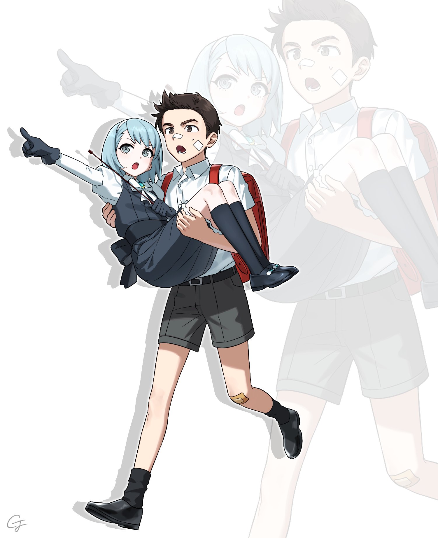1boy 1girl ace_attorney aged_down backpack bag bandage_on_face bandages bandaid bandaid_on_knee bandaid_on_leg belt black_belt black_dress black_footwear black_gloves black_hair black_shorts black_socks blue_hair bow bowtie brooch carrying collared_shirt dick_gumshoe dress franziska_von_karma full_body gloves grey_eyes gwiga0 hairband highres holding jewelry juliet_sleeves kneehighs long_sleeves mole mole_under_eye open_mouth pointing princess_carry puffy_sleeves randoseru red_bag running shirt shoes short_hair short_sleeves shorts socks standing sweatdrop white_background white_bow white_bowtie white_hairband white_shirt