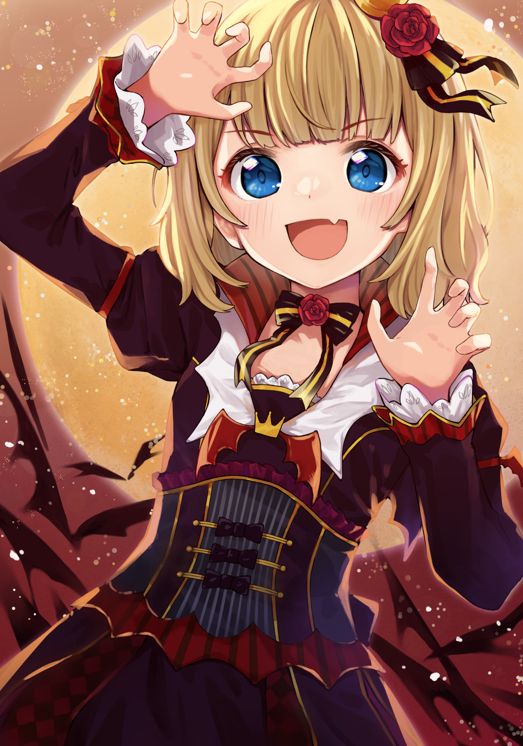 black_bow black_bowtie black_dress blonde_hair blue_eyes bow bowtie claw_pose commentary_request corset dress flower frilled_sleeves frills full_moon hair_flower hair_ornament highres idolmaster idolmaster_million_live! long_sleeves medeshima_marota moon red_dress red_flower red_rose rose short_hair suou_momoko underbust upper_body