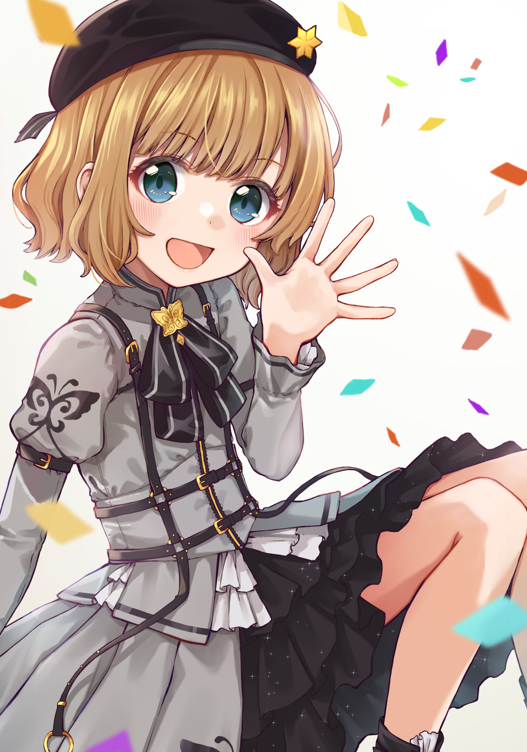 1girl :d beret black_bow black_bowtie black_hat blue_eyes blush bow bowtie brown_hair commentary_request dress frilled_dress frills grey_dress hand_up hat highres idolmaster idolmaster_million_live! idolmaster_million_live!_theater_days juliet_sleeves knees_up layered_dress long_sleeves looking_at_viewer medeshima_marota open_mouth proud_of_stage_(idolmaster) puffy_sleeves short_hair sleeve_garter smile solo suou_momoko waving