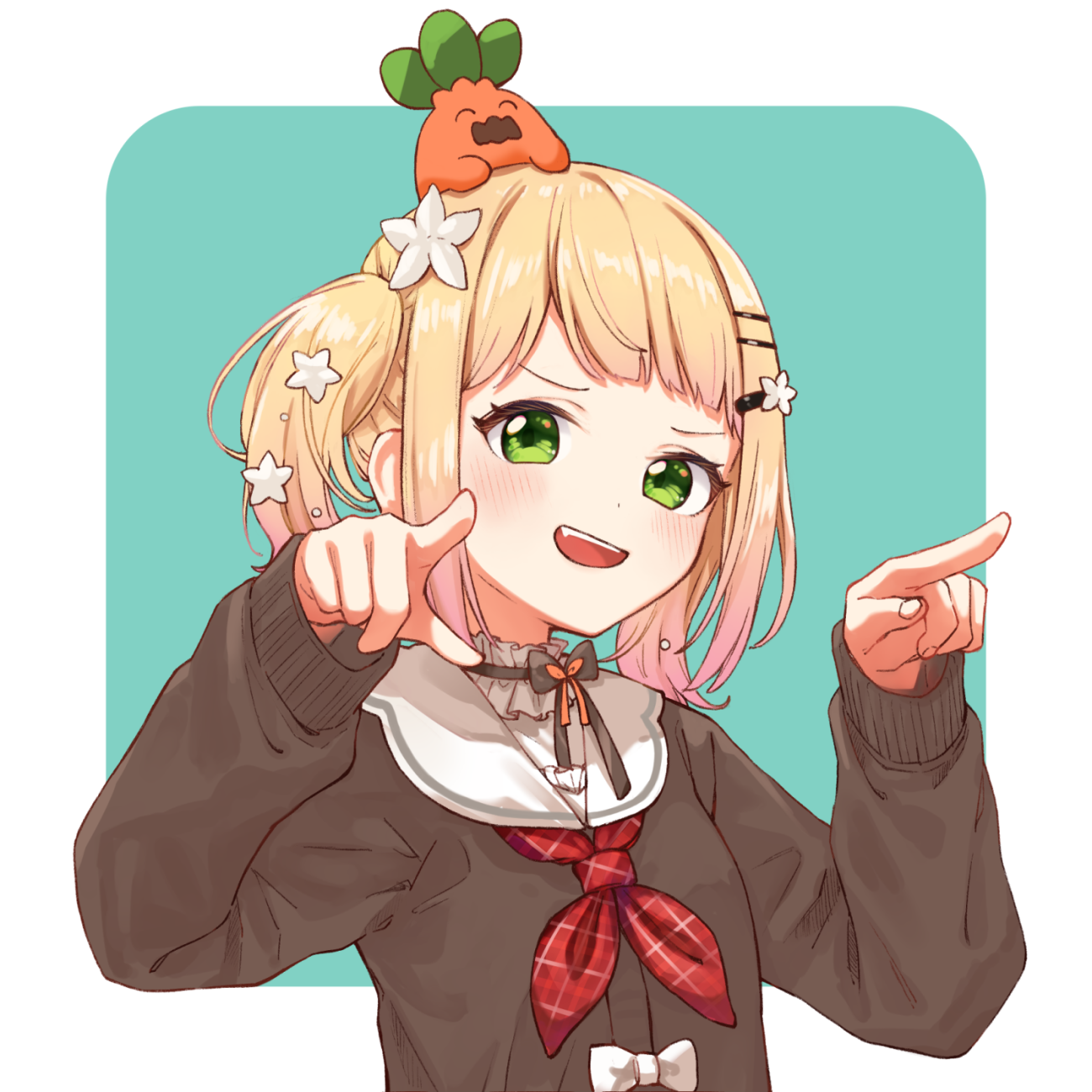 1girl blonde_hair blunt_bangs blush brown_cardigan cardigan commentary creature_on_head green_eyes hair_ornament hairclip highres hololive index_fingers_raised long_sleeves looking_at_viewer medeshima_marota momosuzu_nene momosuzu_nene_(casual) neckerchief nekko_(momosuzu_nene) official_alternate_costume official_alternate_hairstyle pink_hair red_neckerchief sailor_collar smile solo twintails upper_body v-shaped_eyebrows virtual_youtuber white_sailor_collar