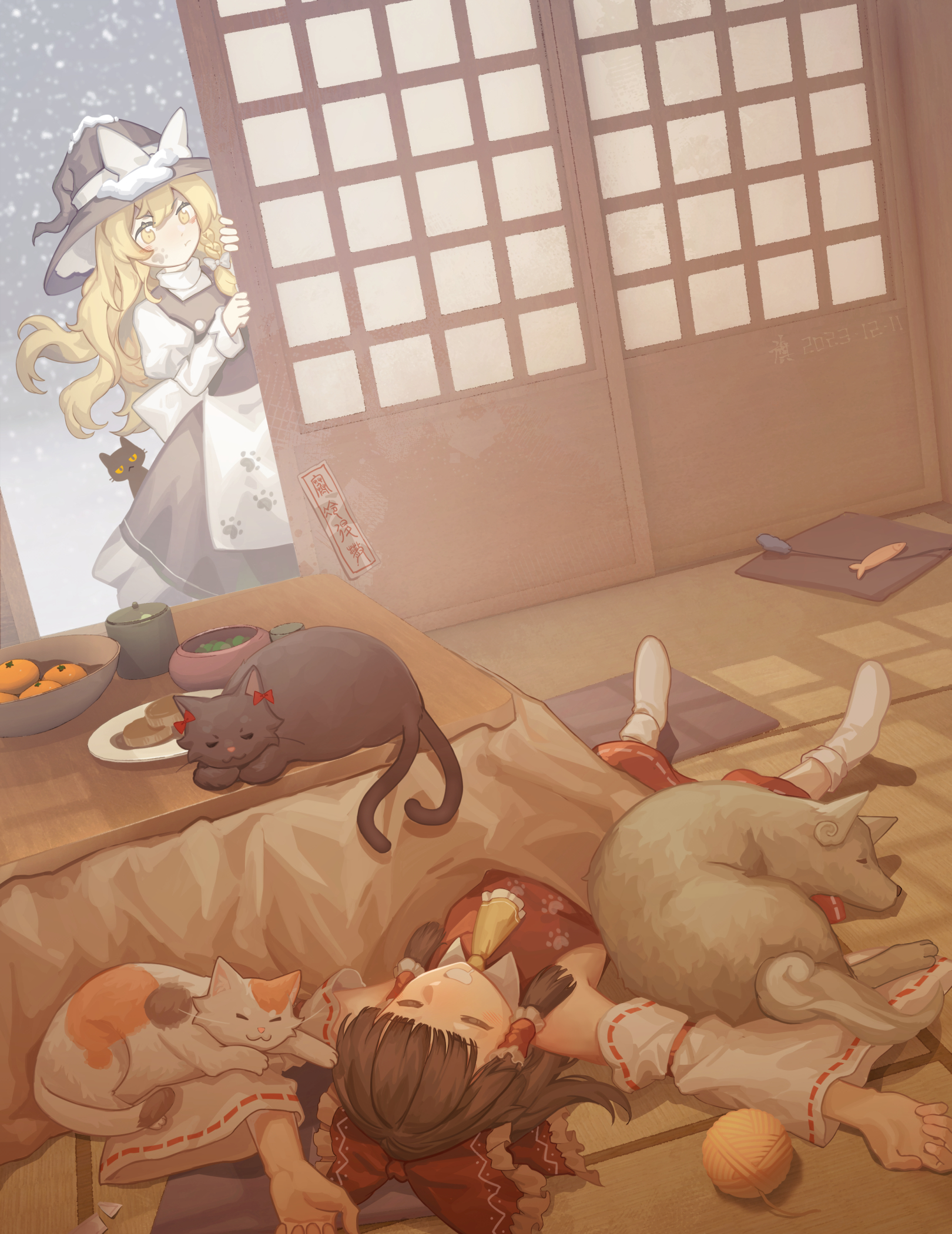 2girls animal apron ascot bare_shoulders black_hair black_headwear black_skirt black_vest blonde_hair bow braid cat commentary_request cushion detached_sleeves food frilled_apron frills fruit furahata_gen goutokuji_mike goutokuji_mike_(cat) hair_bow hair_tubes hakurei_reimu hat hat_bow highres indoors japanese_clothes juliet_sleeves kaenbyou_rin kaenbyou_rin_(cat) kirisame_marisa komainu komano_aunn komano_aunn_(komainu) life_at_the_hakurei_shrine_(touhou) long_hair long_sleeves mandarin_orange multiple_girls nontraditional_miko ofuda puffy_sleeves red_bow ribbon-trimmed_sleeves ribbon_trim shirt shouji sidelocks single_braid skirt sleeping slice_of_life sliding_doors tatami touhou vest white_apron white_bow white_shirt wide_sleeves witch_hat yellow_ascot yellow_eyes zabuton