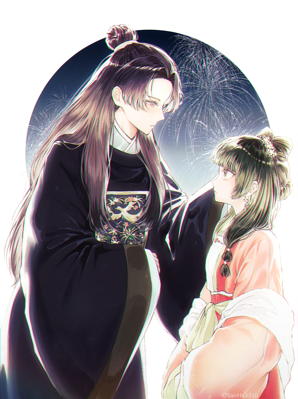 1boy 1girl aerial_fireworks animal_print bird_print blunt_bangs brown_hair chinese_clothes commentary earrings eye_contact fireworks hair_bun hair_ornament hetero highres jewelry jinshi_(kusuriya_no_hitorigoto) kusuriya_no_hitorigoto long_hair looking_at_another maomao_(kusuriya_no_hitorigoto) purple_eyes sanha3310 standing untranslatable_commentary twitter_username very_long_hair wide_sleeves