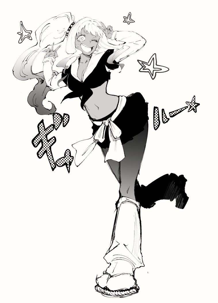 1girl bleach breasts cleavage dark-skinned_female dark_skin full_body long_hair medium_breasts monochrome navel one_eye_closed open_mouth side_ponytail simple_background smile solo suruga_kreuz v very_long_hair wink yayahara_yuyu