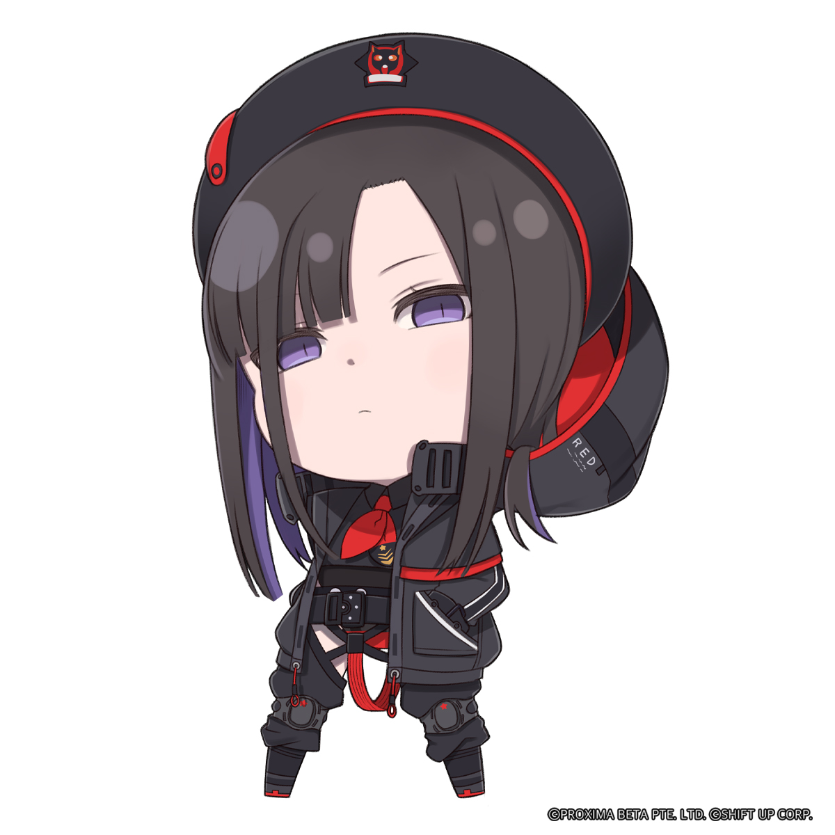 1girl beret black_coat black_footwear black_hair black_hat black_leotard black_pants blunt_bangs chibi closed_mouth clothes_writing coat collared_leotard commentary english_commentary english_text eunhwa_(nikke) goddess_of_victory:_nikke hands_in_pockets hat highres hood hood_up hooded_coat leotard light_frown long_hair long_sleeves looking_at_viewer multicolored_hair official_art open_clothes open_coat pants parted_bangs purple_eyes purple_hair solo standing sticker_(medium) totatokeke two-tone_hair