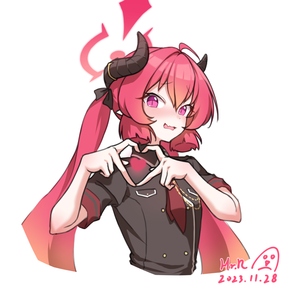 1girl ahoge artist_logo artist_name black_jacket blue_archive blunt_tresses buttons collared_jacket cropped_torso dated double-breasted fang halo hands_up heart heart_hands horns hr.r jacket junko_(blue_archive) logo long_hair looking_at_viewer necktie open_mouth pink_hair pointy_ears purple_eyes red_necktie short_sleeves sidelocks simple_background skin_fang slit_pupils solo twintails upper_body white_background