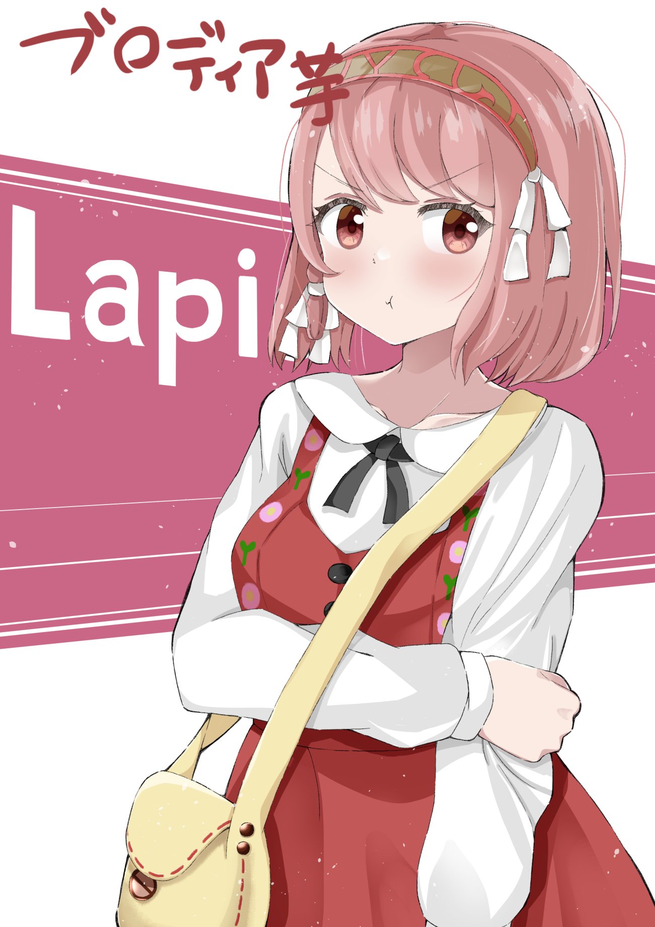 1girl bag character_name fire_emblem fire_emblem_engage grey_hairband hairband handbag highres lapis_(fire_emblem) looking_at_viewer multicolored_hairband nintendo official_alternate_costume oyatsu_(1727318) pink_eyes pink_hair red_hairband ribbon solo two-tone_hairband white_ribbon