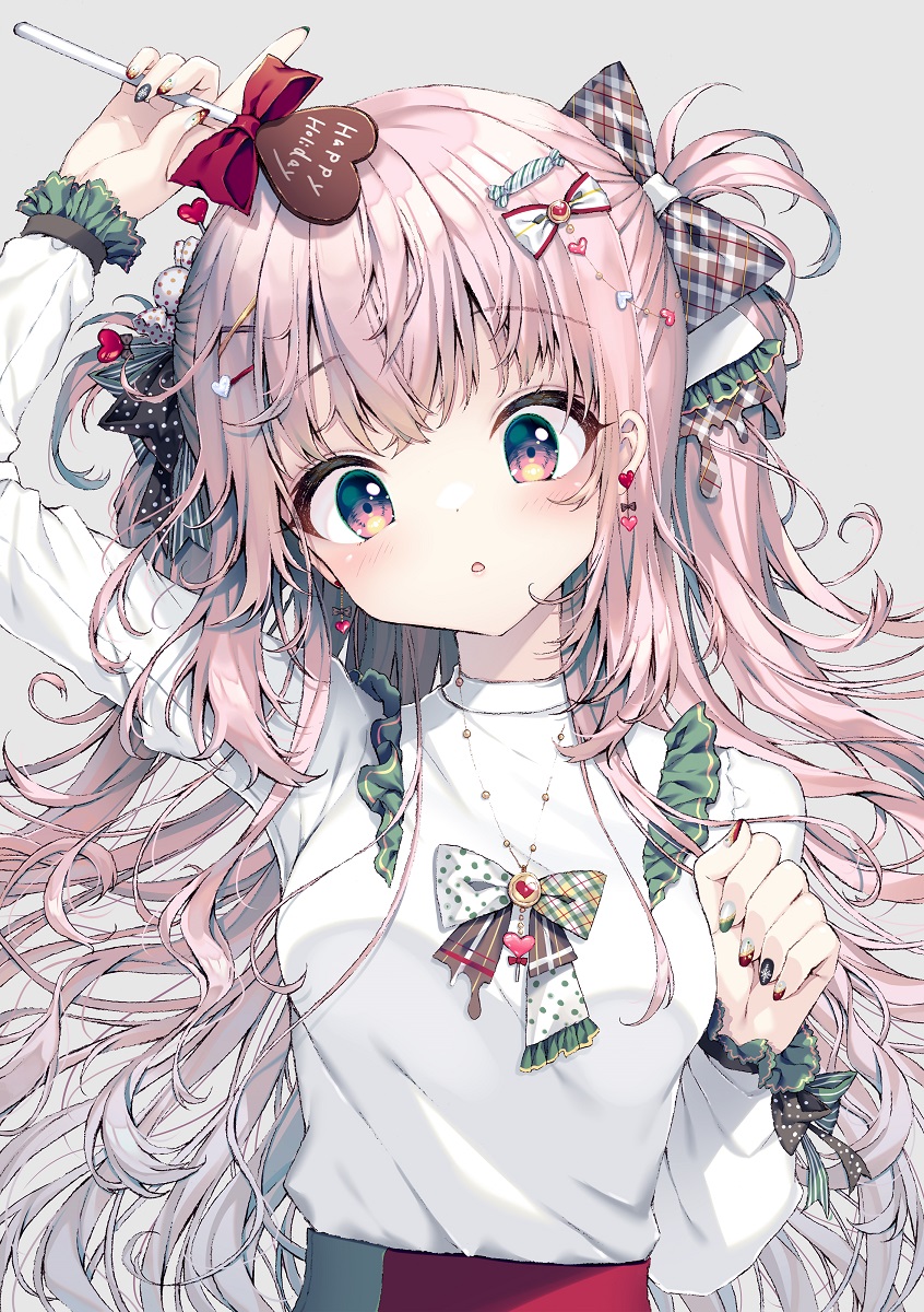 1girl :o arm_up black_bow black_nails bow breasts brown_eyes candy comiket_103 food frilled_sleeves frills grey_background hair_bow hair_ornament hairclip hand_up happy_holidays heart heart-shaped_food heart-shaped_lollipop heart_hair_ornament highres holding holding_candy holding_food holding_lollipop lollipop long_hair long_sleeves looking_at_viewer medium_breasts mizuki_yuuma multicolored_nails nail_art original parted_lips pink_hair plaid_bow polka_dot polka_dot_bow puffy_long_sleeves puffy_sleeves red_nails shaped_lollipop shirt simple_background sleeves_past_wrists solo two_side_up upper_body very_long_hair white_shirt x_hair_ornament