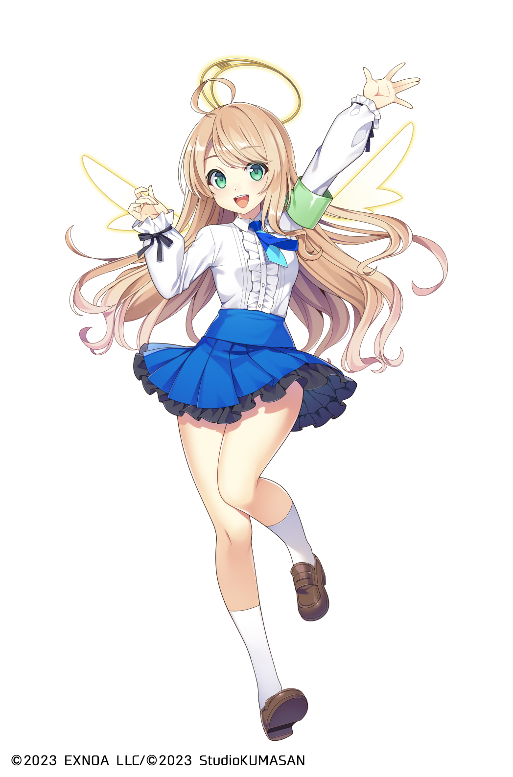 1girl :d ahoge armband asymmetrical_sidelocks azma_(mitch55) black_ribbon blonde_hair blue_necktie blue_skirt brown_shoes company_name copyright_notice curly_hair dress_shirt flat_chest frilled_shirt frilled_skirt frilled_sleeves frills green_armband green_eyes halo hand_up highres leg_up loafers long_hair long_sleeves looking_at_viewer luriel_(twinkle_star_knights) miniskirt necktie official_art open_mouth outstretched_arm outstretched_hand pleated_skirt ribbon shirt shoe_soles shoes short_necktie sidelocks simple_background skirt sleeve_ribbon smile socks solo standing standing_on_one_leg teeth thighs twinkle_star_knights upper_teeth_only white_background white_shirt white_socks wings