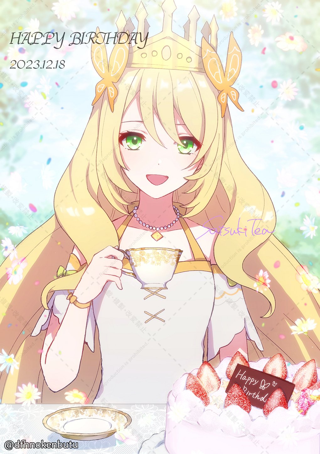 1girl blonde_hair bow butterfly_hair_ornament cake celine_(fire_emblem) crown cup dfhnokenbutu dress dress_bow fire_emblem fire_emblem_engage food gem green_eyes hair_ornament happy_birthday highres holding holding_cup looking_at_viewer nintendo open_mouth orange_gem princess teacup wrist_bow yellow_dress