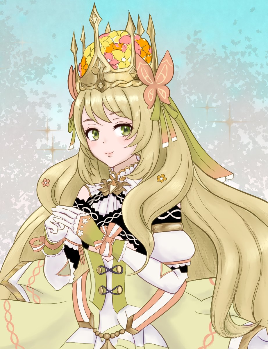 1girl bow butterfly_hair_ornament celine_(fire_emblem) cross-laced_clothes cross-laced_dress crown dress dress_bow fire_emblem fire_emblem_engage gem green_eyes hair_ornament marie_dqx nintendo orange_bow orange_gem princess solo wrist_bow yellow_dress