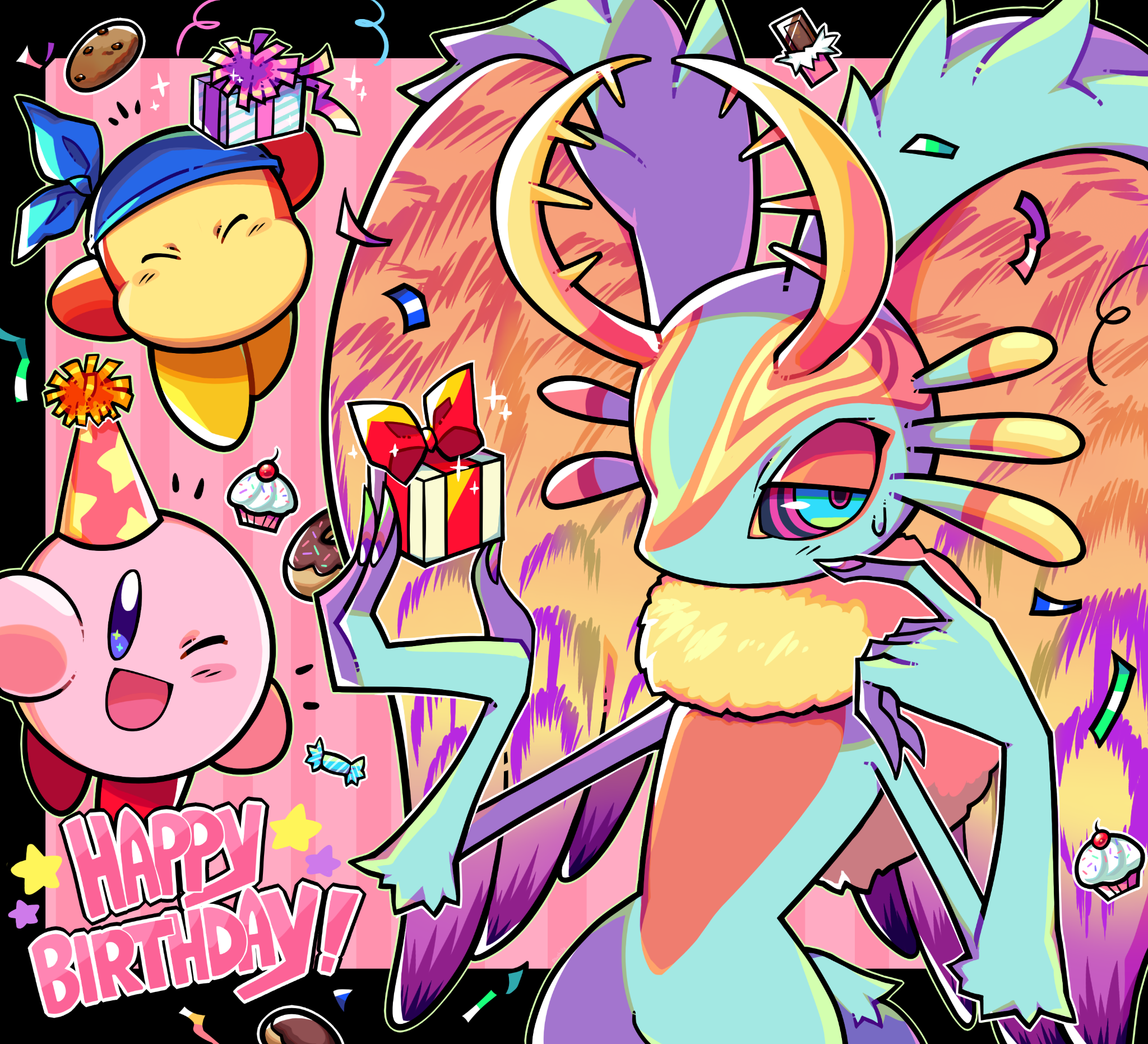 antlers bandana bandana_waddle_dee blue_bandana blushily box candy chocolate chocolate_bar closed_eyes colored_skin confetti cookie cupcake fecto_elfilis food gift gift_box happy_birthday hat highres horns kirby kirby_(series) kirby_and_the_forgotten_land looking_at_viewer multicolored_eyes nintendo party_hat pink_skin smile star_(symbol) sweat wing_ears yellow_fur