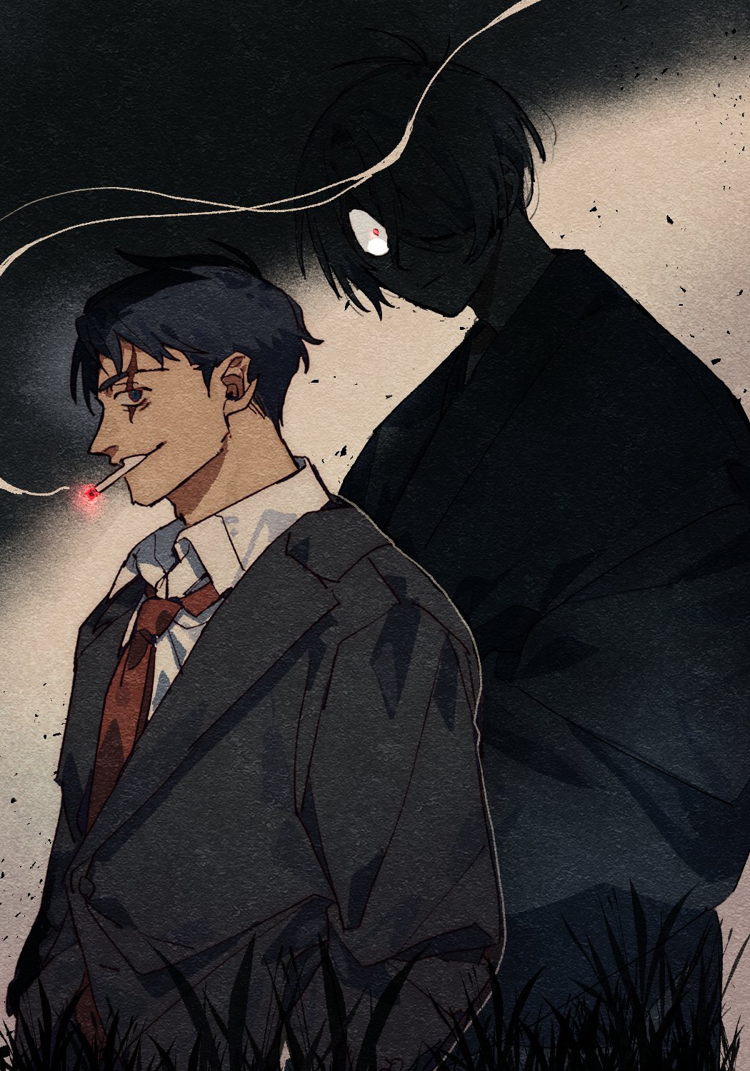 2boys bags_under_eyes black_hair black_jacket from_side gegege_no_kitarou highres jacket japanese_clothes male_focus medama_oyaji medama_oyaji_(human) mizuki_(gegege_no_kitarou) multiple_boys necktie nive_(dn) red_eyes red_necktie scar scar_across_eye scar_on_face shirt short_hair smoke solo white_shirt