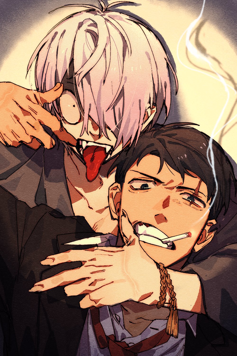 2boys arm_around_shoulder bags_under_eyes black_eyes black_jacket collarbone fingernails gegege_no_kitarou grey_hair highres jacket kitarou_tanjou:_gegege_no_nazo male_focus medama_oyaji medama_oyaji_(human) messy_hair mizuki_(gegege_no_kitarou) mouth_hold multiple_boys necktie nive_(dn) red_necktie scar scar_across_eye scar_on_face sharp_fingernails sharp_teeth shirt smoke smoking tassel teeth teeth_hold tongue tongue_out white_shirt