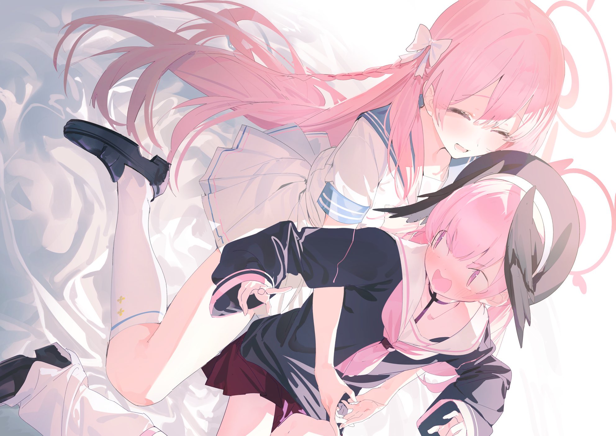 <|>_<|> 2girls ahoge aida_(chinhung0612) beret black_footwear black_headwear black_shirt black_wings blue_archive blue_sailor_collar blush braid closed_eyes halo hanako_(blue_archive) hat head_wings highres koharu_(blue_archive) long_hair long_sleeves loose_socks multiple_girls open_mouth pink_eyes pink_hair pink_halo pleated_skirt red_skirt sailor_collar sailor_shirt school_uniform serafuku shirt shoes single_braid skirt smile socks twintails white_sailor_collar white_skirt white_socks wings