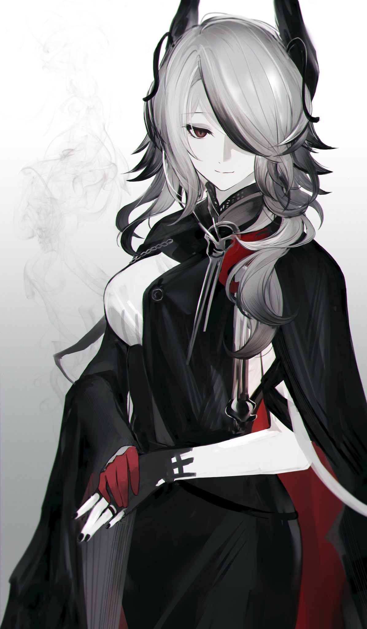 1girl animal_ears arknights asymmetrical_gloves asymmetrical_hair bird_ears black_cape black_dress black_gloves black_hair black_nails breasts cape closed_mouth commentary cowboy_shot dress eyelashes fingerless_gloves gloves gradient_background grey_background grey_hair hair_over_one_eye hair_over_shoulder highres konota_ko koshelna_(arknights) light_smile long_hair looking_at_viewer medium_breasts mismatched_gloves multicolored_hair nail_polish red_eyes red_gloves simple_background single_sleeve smile smoke solo standing two-tone_hair wide_sleeves