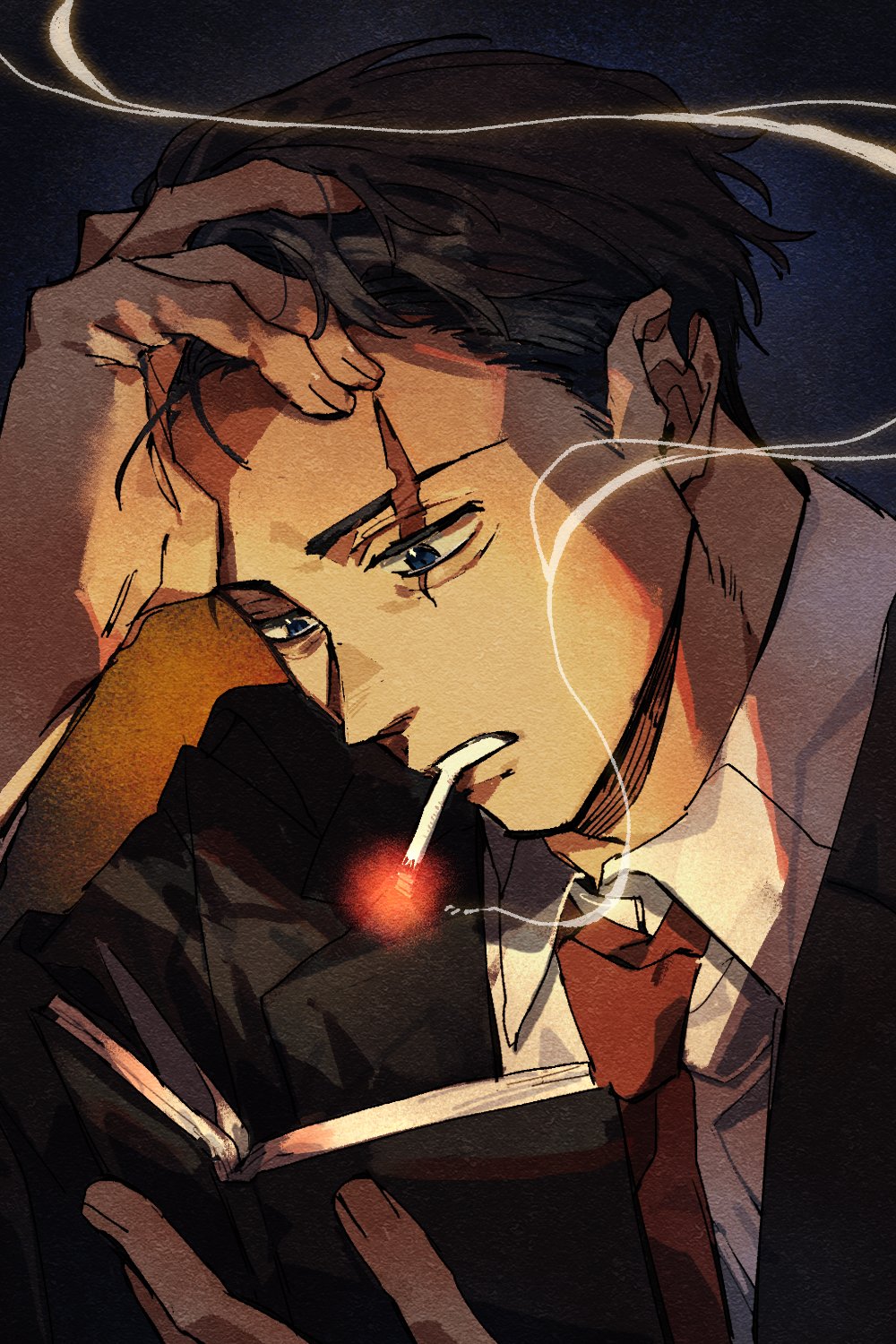 1boy black_hair black_jacket book cigarette gegege_no_kitarou highres jacket kitarou_tanjou:_gegege_no_nazo male_focus mizuki_(gegege_no_kitarou) necktie nive_(dn) open_book reading red_necktie scar scar_across_eye scar_on_face shirt short_hair smoke smoking white_shirt